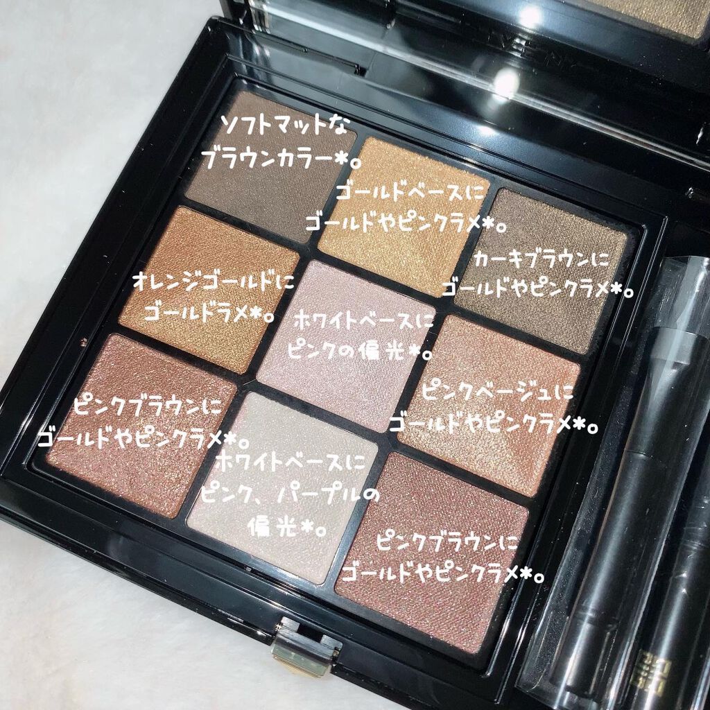 - ジバンシイが選び抜いた、9色ミックスの新アイシャドウ。 フランス語で数字の『9』を表す “neuf(ヌフ)” の言葉のとおり、マット、サテン、グリッター、メタリックの4種のテクスチュアからなる9色で構成されています。塗布すると肌に吸い付くようになじむテクスチュア。ロングラスティングで、メイク直後の美しい仕上がりが、長時間持続します。2種類のブラシをセットできるアプリケーター付き。