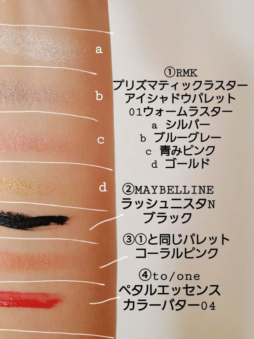 アイブロウは #WHOMEE のレッドブラウンを。 アイメイクは ①#hince の #ニューデップスアイシャドウ イニシャルを上下の瞼に馴染ませる。 ②#snidelbeauty の #フェイススタイリスト の a バーガンディを上瞼の際に 目尻から黒目上あたりまで。 b マスタードを同じく上瞼の際の目頭から 黒目上あたりまで。 c スパークリングゴールドを下瞼の黒目下に。 d フロステッドシルバーをcの両隣に✨ リップとチークは ④#rmsbeauty の #ラプチャー を唇にポンポン塗りにする。 指で馴染ませたら、指についてる残りを頬にも♡ ヘアスタイルは ちょっと変化を付けたくて 少しコテを使って ウルフっぽい形に。 アルジェランの ヘアバームとヘアオイルをほんの少し MIXしてスタイリング💆 #アルジェランヘアバーム → 9/11発売! #モイストグローヘアオイル →既に発売されているもの アウトバスだけでなくスタイリングにも オススメです🙆