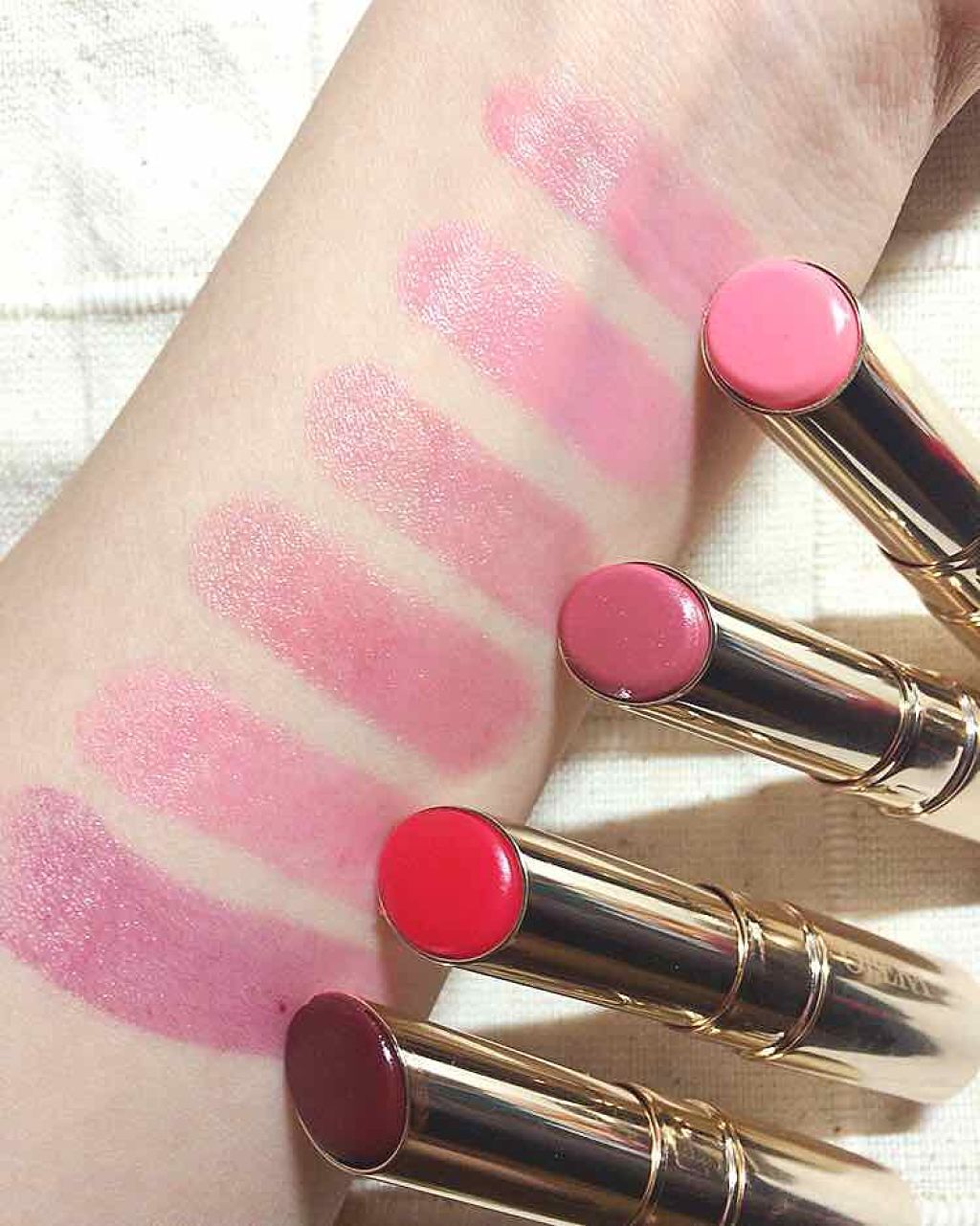 多幸感あふれるクリアなコーラル🩷 特に時間が経つと蛍光感がでてきちゃう。 THEピンクのリップを求めている人にピッタリ! ティッシュオフしても若干色は残ってる! おすすめの塗り方は、いつもよりも少し濃いめに塗ってから、ティッシュオフ!