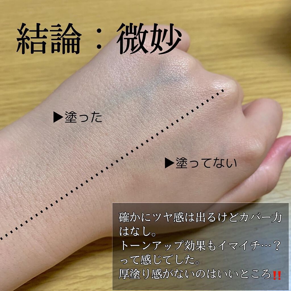 個人的に期待していただけあって結構残念でした😭 まず、カバー力がない! 毛穴のカバーやシミは隠してくれません😭 そしてトーンアップも微妙。あんまり変わってなくない…?って感じ。 この2点がなんとも残念でした。 あとコスパ面で考えると量はかなり入っていますがこのクオリティか…😭と思ってしまいます😭 お肌に艶感がかなり出たのでツヤを出したい人や在宅ワークの時などメイクが薄い人にもおすすめ。 私は好みではなかったです😭