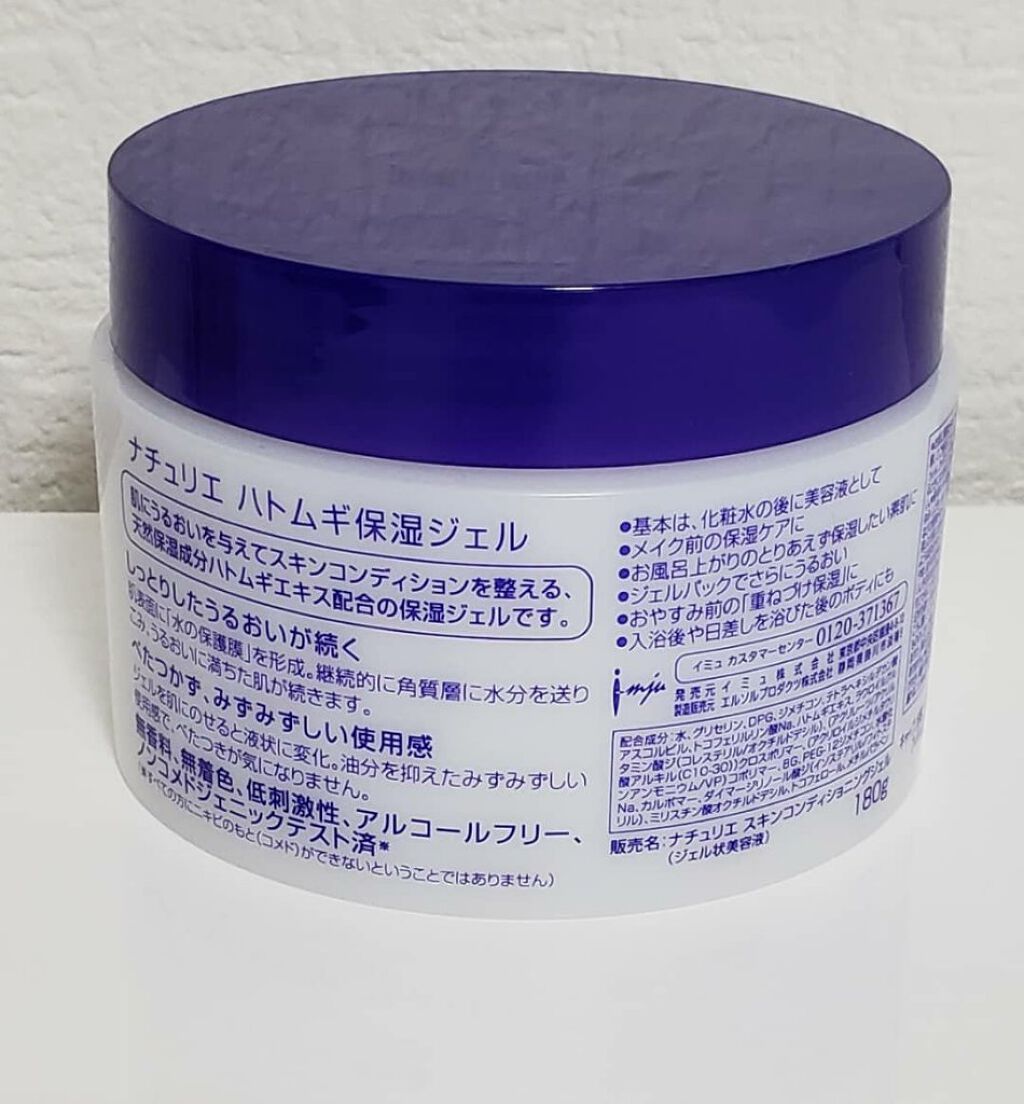 - 肌にうるおいを与えてスキンコンディションを整える、 天然保湿成分ハトムギエキス配合の保湿ジェルです。 ジェルを肌にのせると液状に変化して、肌表面に「水の保護膜」を形成。 継続的に角質層に水分を送りこむので、うるおいに満ちた肌が続きます。 油分を抑えたみずみずしい使用感でべたつきが気になりません。 基本は化粧水の後にたっぷり使ってください。 メイク前の保湿やお風呂上がりの「とりあえず保湿」、ボディにも。 ●使用方法 ■基本は、化粧水の後に美容液として 化粧水の後にたっぷり使ってください。 500円玉大の量を2回重ねづけするのが目安です。 その後、お好みで乳液やクリームを重ねてください。 ■乳液やクリームのべたつきが気になるときに 水の保護膜でうるおいをキープし、べたつきません。 ■メイク前の保湿ケアに 油分の多いスキンケア品を使うとメイクがくずれやすいときは、 メイク前の保湿ケアとしてもお使いいただけます。 油分に頼らず肌のうるおいを守り、ヨレやくずれを防ぎます。 ■お風呂上がりの「とりあえず保湿」に ゆっくりスキンケアができないときは、 素肌に直接なじませて乾燥から肌を守ります。 油分が少ないので、後から行うスキンケアの浸透(※)を妨げません。 ※角質層まで ■ジェルパックでさらにうるおい 特に乾燥が気になるときは、 500円玉大3枚程度の量を顔全体にのせて 約5分間経ってから、肌になじませてください。 ■おやすみ前の「重ねづけ保湿」に 500円玉大の量のジェルをもう一度なじませることで、 睡眠中の乾燥を防ぎます。 ■ボディにも べたつかないので、毎日の入浴後や日差しを浴びた後などの ボディのスキンケアにもおすすめです。