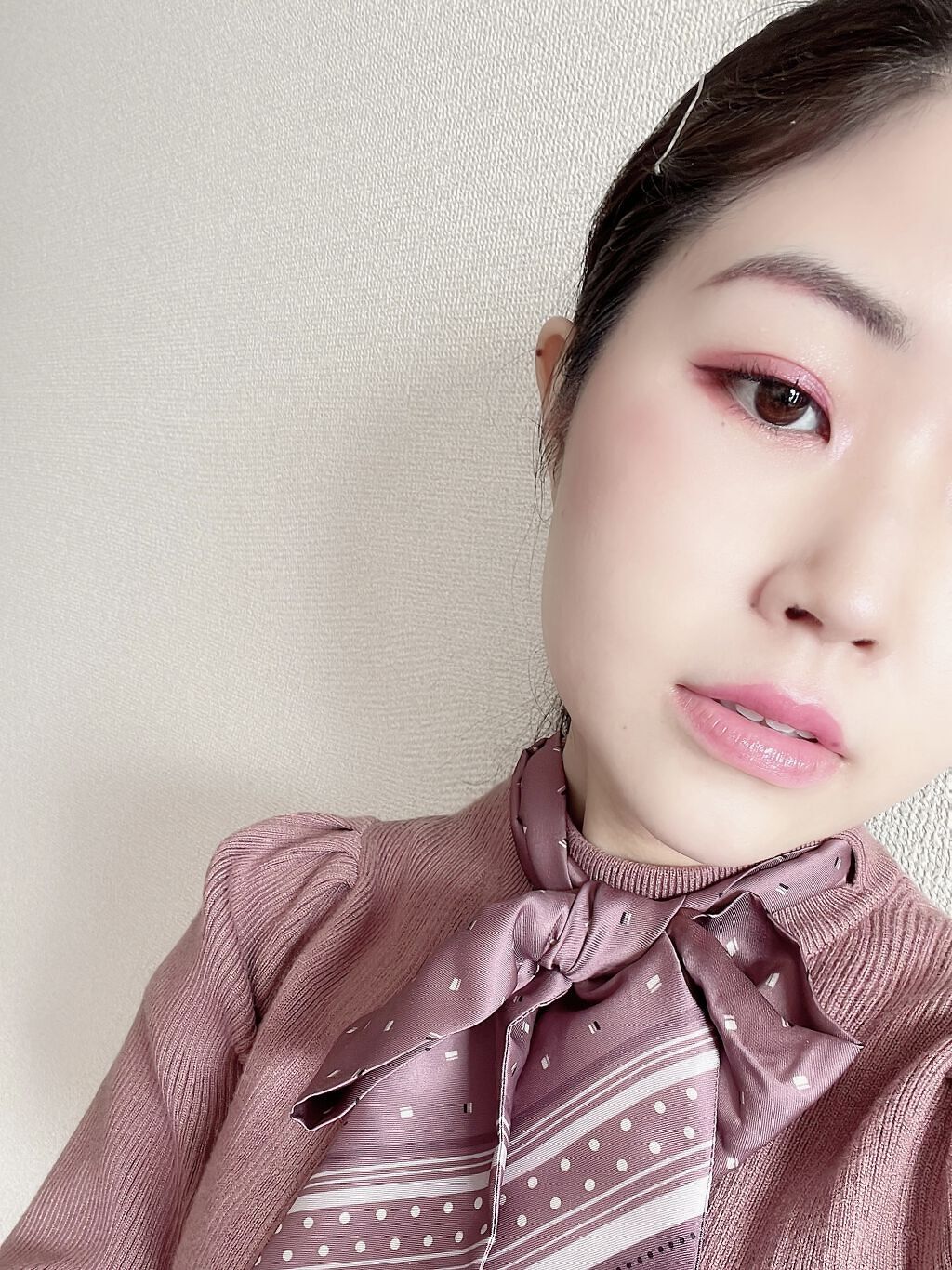 引きで見たらそこまで派手でないのでメイクだけ浮く感じは全くないです👌 スモアグレージュのアイライナーが良い感じに馴染むのでキツくなりすぎず、でもぱっちりした目元になります😊 パーソナルカラーをバチバチに意識したメイクをしてみましたがやっぱりしっくりきますね😆