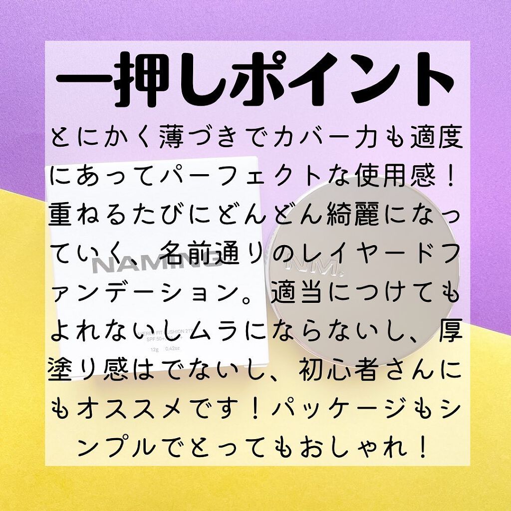 NAMING.レイヤードフィットクッションcolor>>>21Y/21P▢▣▢▣▢▣▢▣▢▣▢▣▢▣▢▣▢▣▢シンプルでシックなパケが魅力的なNAMINGのクッションファンデ🤍今回はレイヤードフィットクッションの紹介!オイル配合で使った感じ肌...