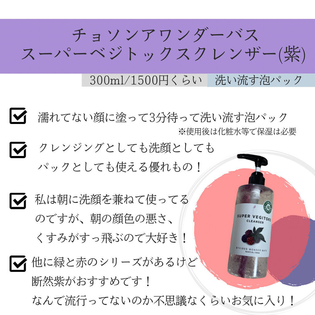 ※2024年使用品クレンジング・商品名WONDERBATHスーパーベジトックスクレンザーグリーンミニ5回分・値段わからない(220円で購入)・購入場所ドンキ・評価★★☆☆☆さっぱり系ですき人によっては乾燥しそう見た目めっちゃ青汁で重め濃密泡に...