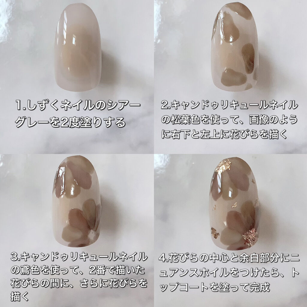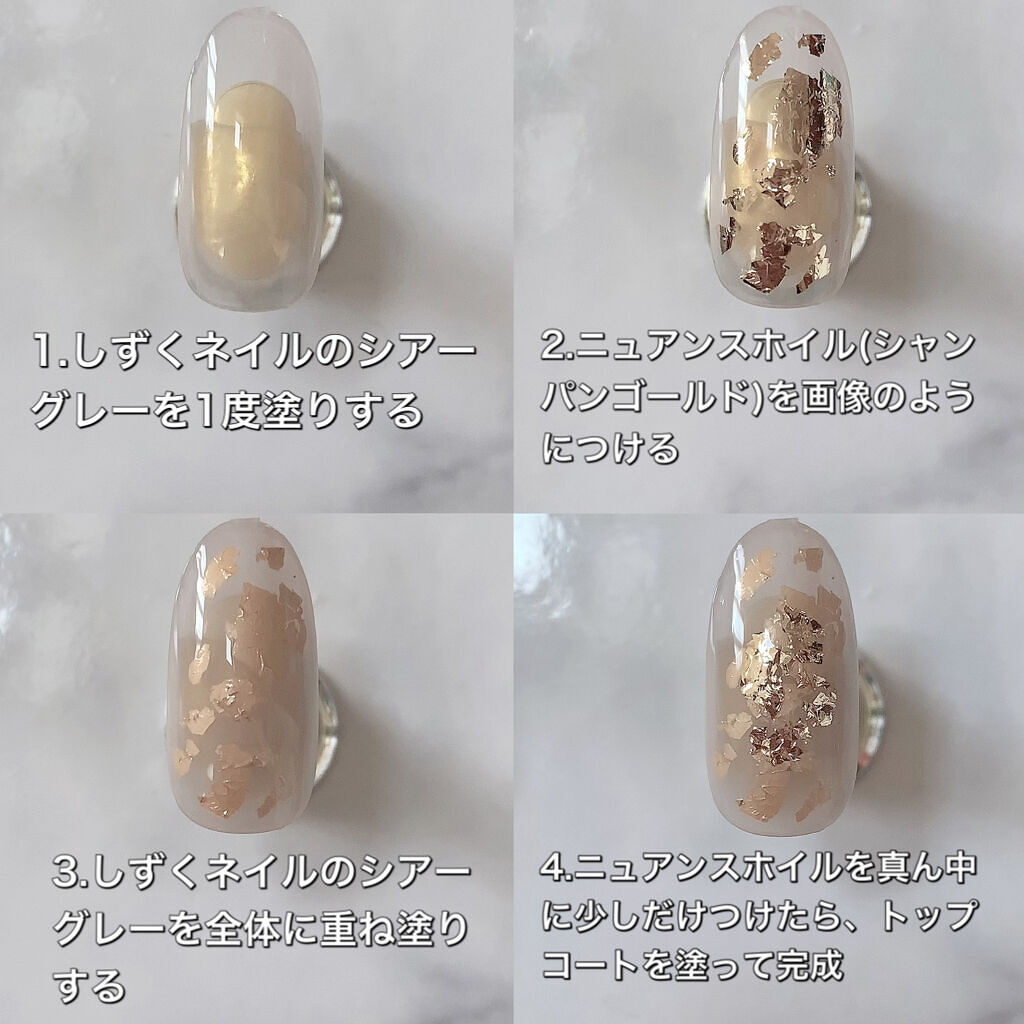 ワンカラーでも指ごとに色を変えるだけでオシャレに見えます💕 画像のようにゴールドラインとストーンを少し足すだけで華やかさがアップ🥰 何度かご紹介したことのあるスポンジで作るグラデーションです✨ スポンジを使うことで境目が綺麗に馴染んでくれます💕 アルミホイルの上でブラウンとトップコートを1:1くらいで混ぜたものを、トップコートのハケに取って3箇所に塗るだけ👌 事前に混ぜたものを塗ることで、爪の上でぼかすより簡単に出来ます💕 ベースカラーが乾く前に点置きしてぼかすことで綺麗にぼかせます✨ スピードが大事なので、使うポリッシュのキャップは全て開けておきましょう😊 天然石のラインはガタガタの方がより天然石っぽく見えるので、ラインを描くのが苦手な方でも大丈夫🙆♀️ 難しそうに見えて、やってみると意外と簡単に出来ます♡