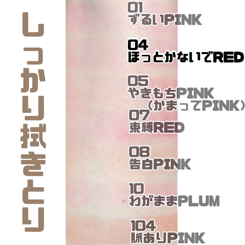 - <01 こなれBEIGE【新】> リンゴ酸ジイソステアリル、ダイマージリノール酸ダイマージリノレイルビス(ベヘニル/イソステアリル/フィトステリル)、(アジピン酸/カプリン酸/カプリル酸/ヘプタン酸)ペンタエリスリチル、(VP/ヘキサデセン)コポリマー、ビスジグリセリルポリアシルアジペート-2、パラフィン、オクチルドデカノール、乳酸メンチル、マイクロクリスタリンワックス、1,2-ヘキサンジオール、イソステアリン酸ソルビタン、酸化チタン、酸化鉄、合成ワックス、セチルPEG/PPG-10/1ジメチコン、ジステアルジモニウムヘクトライト、酢酸トコフェロール、香料、炭酸プロピレン、赤202、リモネン、トリエトキシカプリリルシラン、リナロール、シトラール、ホホバ種子油、ヒアルロン酸Na、アルガニアスピノサ核油 <02 告白PINK【新】> リンゴ酸ジイソステアリル、ダイマージリノール酸ダイマージリノレイルビス(ベヘニル/イソステアリル/フィトステリル)、(アジピン酸/カプリン酸/カプリル酸/ヘプタン酸)ペンタエリスリチル、ビスジグリセリルポリアシルアジペート-2、(VP/ヘキサデセン)コポリマー、パラフィン、オクチルドデカノール、乳酸メンチル、マイクロクリスタリンワックス、1,2-ヘキサンジオール、イソステアリン酸ソルビタン、酸化チタン、合成ワックス、セチルPEG/PPG-10/1ジメチコン、ジステアルジモニウムヘクトライト、赤202、酢酸トコフェロール、香料、⻩5、炭酸プロピレン、⻘1、リモネン、リナロール、シトラール、アルガニアスピノサ核油、ホホバ種子油、ヒアルロン酸Na <03 きまぐれBROWN【新】> リンゴ酸ジイソステアリル、ダイマージリノール酸ダイマージリノレイルビス(ベヘニル/イソステアリル/フィトステリル)、(アジピン酸/カプリン酸/カプリル酸/ヘプタン酸)ペンタエリスリチル、(VP/ヘキサデセン)コポリマー、ビスジグリセリルポリアシルアジペート-2、パラフィン、オクチルドデカノール、乳酸メンチル、マイクロクリスタリンワックス、1,2-ヘキサンジオール、イソステアリン酸ソルビタン、酸化鉄、酸化チタン、合成ワックス、セチルPEG/PPG-10/1ジメチコン、ジステアルジモニウムヘクトライト、酢酸トコフェロール、香料、炭酸プロピレン、赤104(1)、リモネン、リナロール、シトラール、ホホバ種子油、ヒアルロン酸Na、アルガニアスピノサ核油 <04 愛されPINK【新】> リンゴ酸ジイソステアリル、ダイマージリノール酸ダイマージリノレイルビス(ベヘニル/イソステアリル/フィトステリル)、(アジピン酸/カプリン酸/カプリル酸/ヘプタン酸)ペンタエリスリチル、(VP/ヘキサデセン)コポリマー、ビスジグリセリルポリアシルアジペート-2、パラフィン、オクチルドデカノール、乳酸メンチル、マイクロクリスタリンワックス、1,2-ヘキサンジオール、イソステアリン酸ソルビタン、酸化チタン、合成ワックス、セチルPEG/PPG-10/1ジメチコン、ジステアルジモニウムヘクトライト、酸化鉄、酢酸トコフェロール、香料、赤202、黄4、炭酸プロピレン、リモネン、リナロール、シトラール、アルガニアスピノサ核油、ホホバ種子油、ヒアルロン酸Na <05 無敵テラコッタ【新】> リンゴ酸ジイソステアリル、ダイマージリノール酸ダイマージリノレイルビス(ベヘニル/イソステアリル/フィトステリル)、(アジピン酸/カプリン酸/カプリル酸/ヘプタン酸)ペンタエリスリチル、(VP/ヘキサデセン)コポリマー、ビスジグリセリルポリアシルアジペート-2、パラフィン、オクチルドデカノール、乳酸メンチル、マイクロクリスタリンワックス、酸化鉄、1,2-ヘキサンジオール、イソステアリン酸ソルビタン、セチルPEG/PPG-10/1ジメチコン、合成ワックス、酸化チタン、ジステアルジモニウムヘクトライト、酢酸トコフェロール、香料、炭酸プロピレン、リモネン、トリエトキシカプリリルシラン、リナロール、シトラール、ホホバ種子油、ヒアルロン酸Na、アルガニアスピノサ核油 <06 脈ありPINK【新】> リンゴ酸ジイソステアリル、ダイマージリノール酸ダイマージリノレイルビス(ベヘニル/イソステアリル/フィトステリル)、(アジピン酸/カプリン酸/カプリル酸/ヘプタン酸)ペンタエリスリチル、(VP/ヘキサデセン)コポリマー、ビスジグリセリルポリアシルアジペート-2、パラフィン、オクチルドデカノール、乳酸メンチル、マイクロクリスタリンワックス、1,2-ヘキサンジオール、イソステアリン酸ソルビタン、酸化チタン、酸化鉄、合成ワックス、セチルPEG/PPG-10/1ジメチコン、ジステアルジモニウムヘクトライト、酢酸トコフェロール、香料、炭酸プロピレン、赤202、リモネン、リナロール、シトラール、ホホバ種子油、ヒアルロン酸Na、アルガニアスピノサ核油 <07 惚れさせCASSIS【新】> リンゴ酸ジイソステアリル、ダイマージリノール酸ダイマージリノレイルビス(ベヘニル/イソステアリル/フィトステリル)、(アジピン酸/カプリン酸/カプリル酸/ヘプタン酸)ペンタエリスリチル、ビスジグリセリルポリアシルアジペート-2、(VP/ヘキサデ