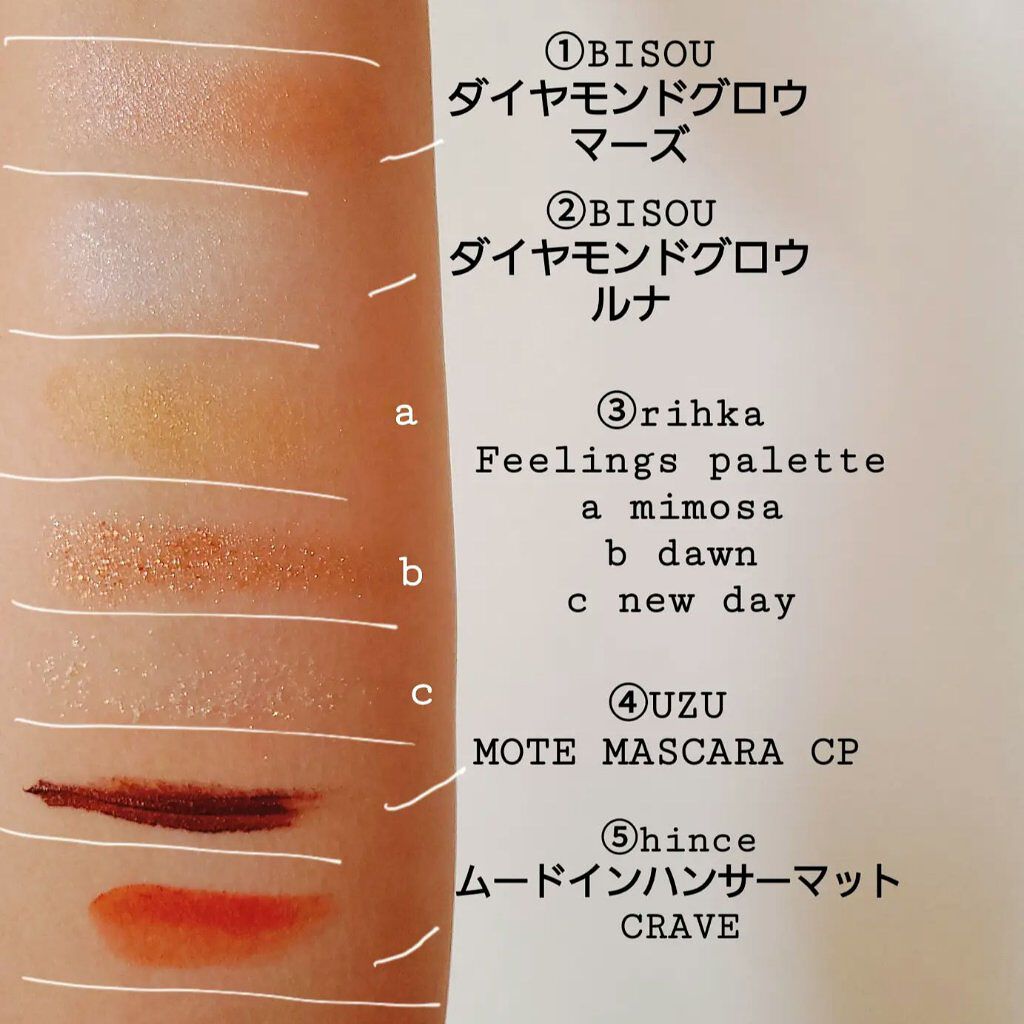 アイブロウは#whomeeのレッドブラウンを使用。 アイメイクは①#アンドビーの#クリームアイシャドウ マスタードを上下の瞼に。 アイメイクは②#misshaの#グリッタープリズムシャドウマーブル #ストームプリズムを①に重ねて。 下瞼は全体ではなく、黒目下にだけ✨ アイメイクは③#hinceの#ニューアンビエンスカラーアイライナー #エクレクティックを4枚目のように三角形に入れる。 チークは⑤#bisouの#ダイヤモンドグロウ マーズをほんのり✨ リップは⑥①のマスタードを塗った後に#celvokeの#エンスロールマットリップス 03を💋