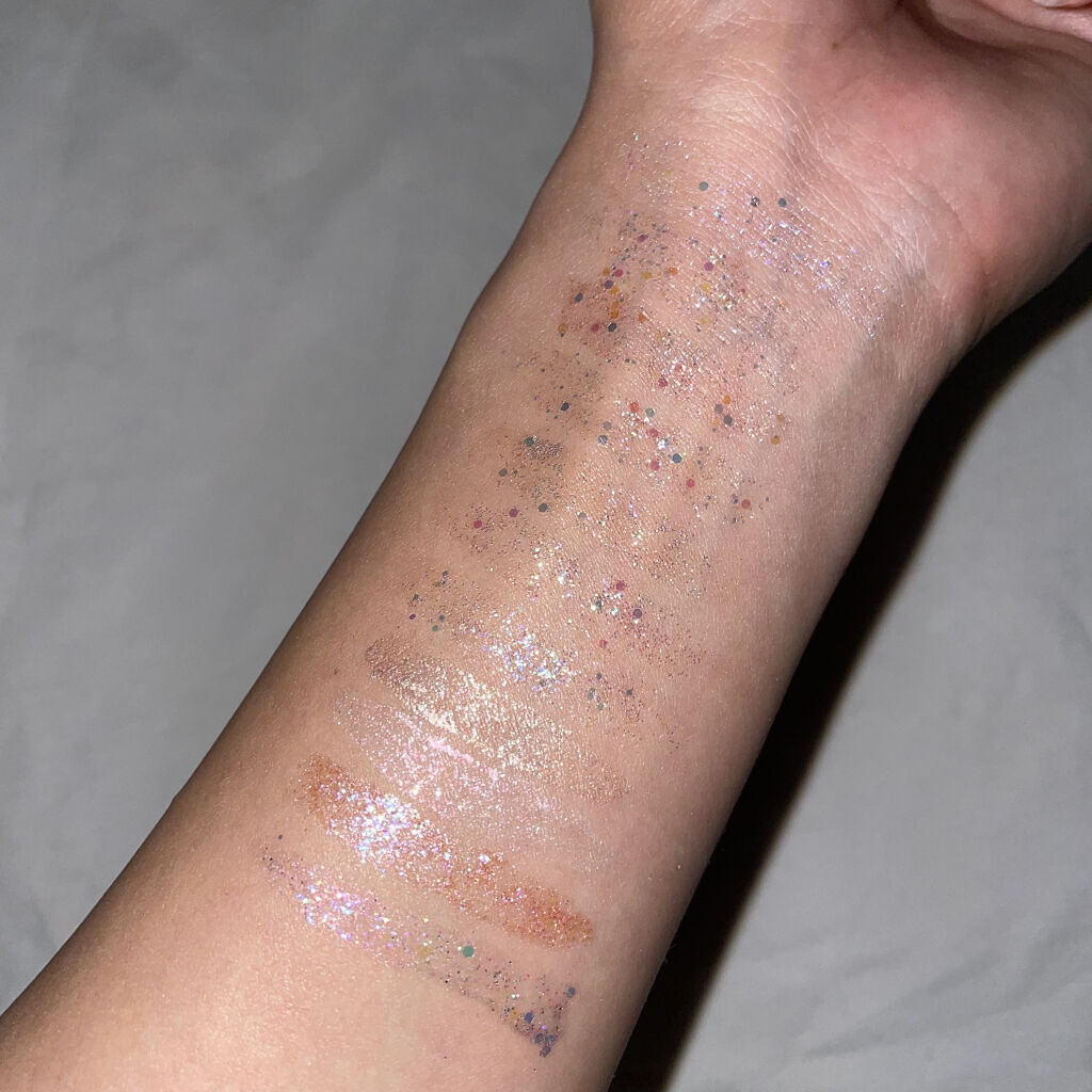 青や紫など寒色系のラメが入ったグリッターです。 オーロラっぽいカラーのラメやホログラムがたくさん入っています。 ピンクベースのグリッターです。 オレンジベースのグリッターにピンクとオレンジの細かいラメが入っています。 見た目はイエローっぽいカラーですが塗ってみるとグリッター自体に色はないので使いやすいカラーです。 グリッター自体に色がついてないのでどんなメイクにも合わせやすいです。 ベージュっぽいゴールドのラメライナーです。 白っぽいピンクのラメライナーです。 ピンクベージュっぽいベースのグリッターです。 紫ベースのグリッターです。多色ラメとホログラムが入っています。