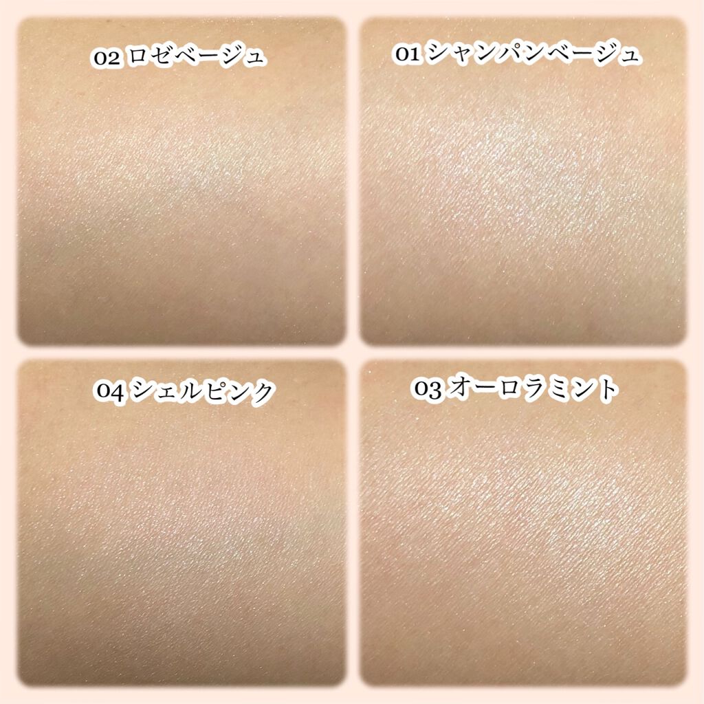 - <01 シャンパンベージュ> トリイソステアリン酸ポリグリセリル-2、トリエチルヘキサノイン、(フッ化/水酸化/酸化)/(Mg/K/ケイ素)、ヘキサ(ヒドロキシステアリン酸/ステアリン酸/ロジン酸)ジペンタエリスリチル、ミリスチン酸亜鉛、(HDI/トリメチロールヘキシルラクトン)クロスポリマー、ペンチレングリコール、ビスジグリセリルポリアシルアジペート-2、フェノキシエタノール、ハイドロゲンジメチコン、メチルパラベン、シリカ、トコフェロール、BG、水、ヒアルロン酸Na、カミツレ花エキス、ラベンダー花エキス、ローズマリー葉エキス、タルク、マイカ、酸化チタン、酸化鉄、酸化スズ、水酸化Al <02 ロゼベージュ> トリイソステアリン酸ポリグリセリル-2、トリエチルヘキサノイン、(フッ化/水酸化/酸化)/(Mg/K/ケイ素)、ヘキサ(ヒドロキシステアリン酸/ステアリン酸/ロジン酸)ジペンタエリスリチル、ミリスチン酸亜鉛、(HDI/トリメチロールヘキシルラクトン)クロスポリマー、ペンチレングリコール、ビスジグリセリルポリアシルアジペート-2、フェノキシエタノール、ハイドロゲンジメチコン、メチルパラベン、シリカ、トコフェロール、BG、水、ヒアルロン酸Na、カミツレ花エキス、ラベンダー花エキス、ローズマリー葉エキス、タルク、マイカ、酸化チタン、酸化鉄、酸化スズ、水酸化Al <03 オーロラミント> トリイソステアリン酸ポリグリセリル-2、トリエチルヘキサノイン、(フッ化/水酸化/酸化)/(Mg/K/ケイ素)、ヘキサ(ヒドロキシステアリン酸/ステアリン酸/ロジン酸)ジペンタエリスリチル、ミリスチン酸亜鉛、(HDI/トリメチロールヘキシルラクトン)クロスポリマー、ペンチレングリコール、ビスジグリセリルポリアシルアジペート-2、フェノキシエタノール、ハイドロゲンジメチコン、メチルパラベン、シリカ、トコフェロール、BG、水、ヒアルロン酸Na、カミツレ花エキス、ラベンダー花エキス、ローズマリー葉エキス、タルク、マイカ、酸化チタン、合成フルオロフロゴパイト、酸化鉄、酸化スズ、グンジョウ、水酸化Al <04 シェルピンク> トリイソステアリン酸ポリグリセリル-2、トリエチルヘキサノイン、(フッ化/水酸化/酸化)/(Mg/K/ケイ素)、ヘキサ(ヒドロキシステアリン酸/ステアリン酸/ロジン酸)ジペンタエリスリチル、ミリスチン酸亜鉛、(HDI/トリメチロールヘキシルラクトン)クロスポリマー、ペンチレングリコール、ビスジグリセリルポリアシルアジペート-2、フェノキシエタノール、ハイドロゲンジメチコン、メチルパラベン、シリカ、トコフェロール、BG、水、ヒアルロン酸Na、カミツレ花エキス、ラベンダー花エキス、ローズマリー葉エキス、タルク、マイカ、酸化チタン、酸化鉄、グンジョウ、酸化スズ、水酸化Al