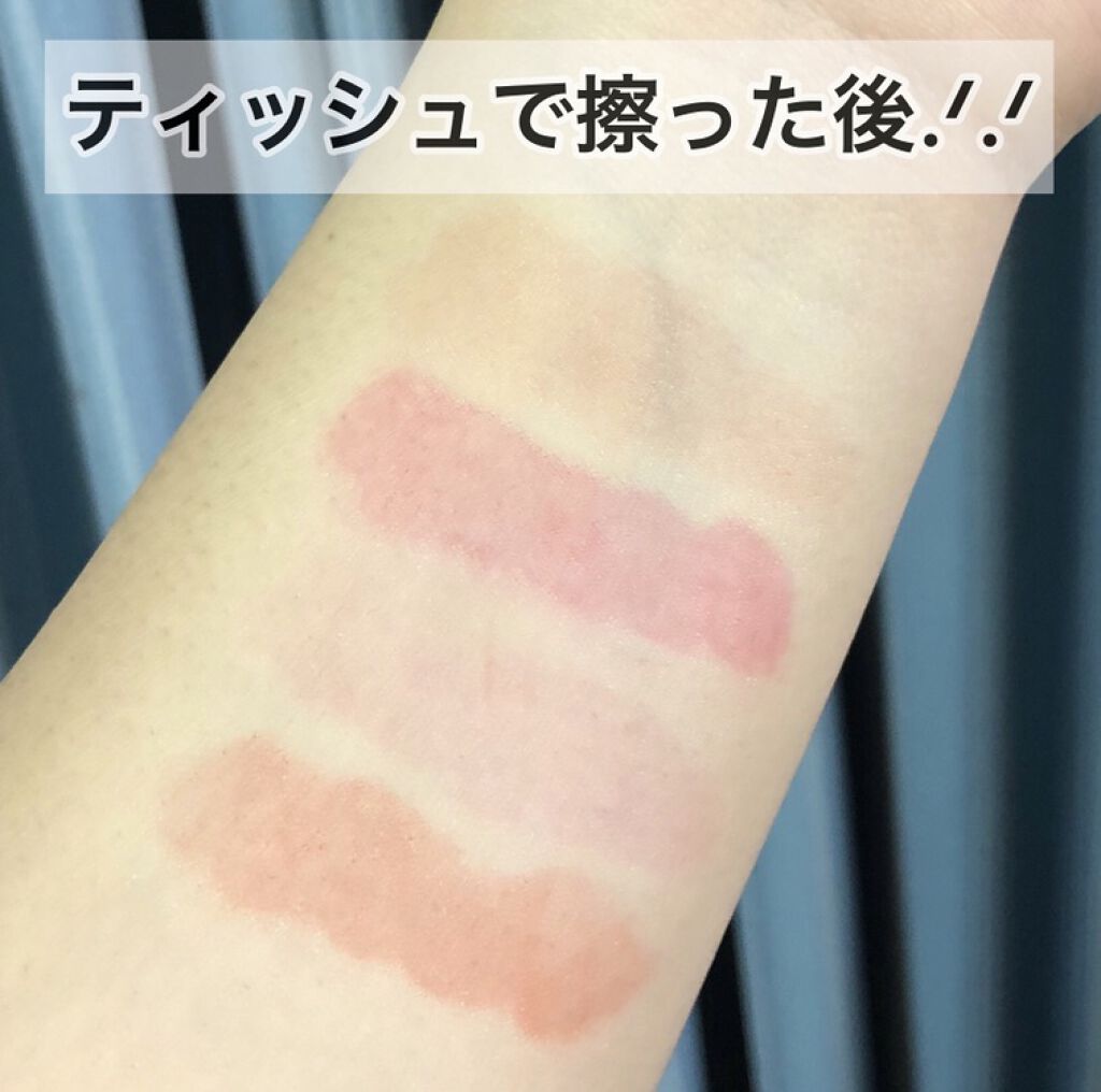 ティッシュオフ後の画像を見ていただければわかるかと思いますがすごくモチがいいです◎ ティッシュオフすると艶感がなくなってしまいますが定着してくれて落ちにくくなります🍀 甘めのお菓子(?)ジュース(?)みたいな香りがついているので香り付きのリップが苦手な方は注意です 蛍光色にならないし色持ちいいし塗りやすいし 1本買ったら人気の理由がわかった🥳