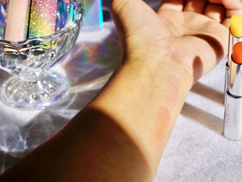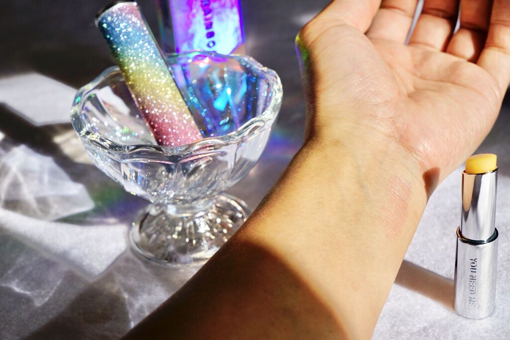 キラキラパケの可愛いリップバーム♡ 上部をプッシュすると下からポンッと出てくるよ✧*。 スルスルとろけて自然にうるうる唇に…💋 レインボーの方はpHよって発色が異なるんだって😳! 血色感良くなるから普段使いにとっても便利だね🫶