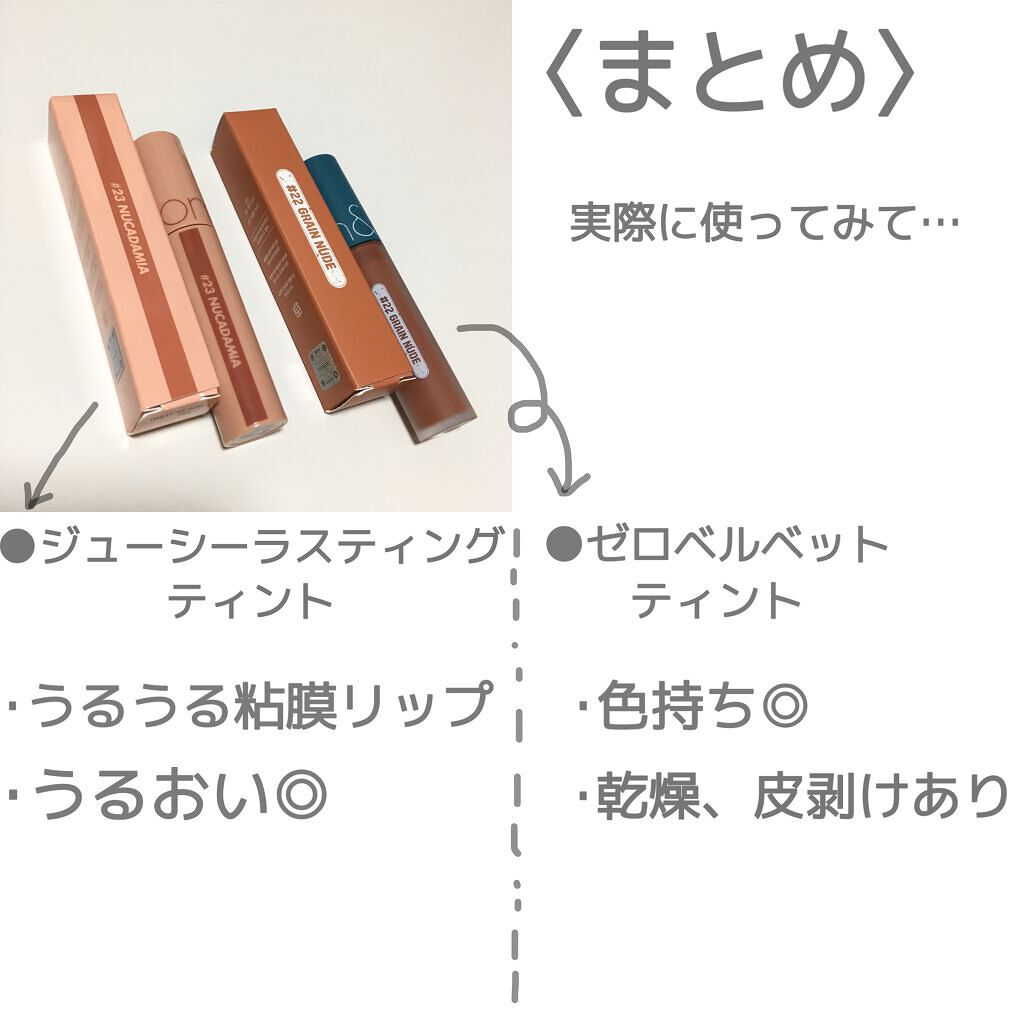 マットリップは初めて購入しました🌷実際に使ってみたので、特徴まとめました↓ rom&ndゼロベルベットティント22 グレインヌード・色持ちがとにかく驚異的・長く付けていると、乾燥と皮剥け少し感じます!・少しつけて指で馴染ませるのがオススメ✨ rom&ndジューシーラスティングティント23 ヌカダミア・色持ちはゼロベルベットよりはなし・長く付けていても潤ってます💋・粘膜リップの様で、私の唇(イエベ秋)との相性が良かったです ジューシーラスティングティントは他の色も持っていて、唇が荒れないところがとても好きです💘