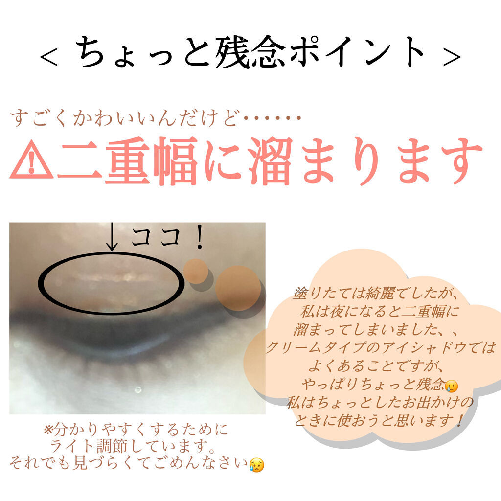 | クリームアイシャドウランキング第10位 | ぷるぷるとしたテクスチャーが気持ち良く 濡れ艶まぶたが手に入るとても綺麗なアイシャドウ | 詳細を見る | |