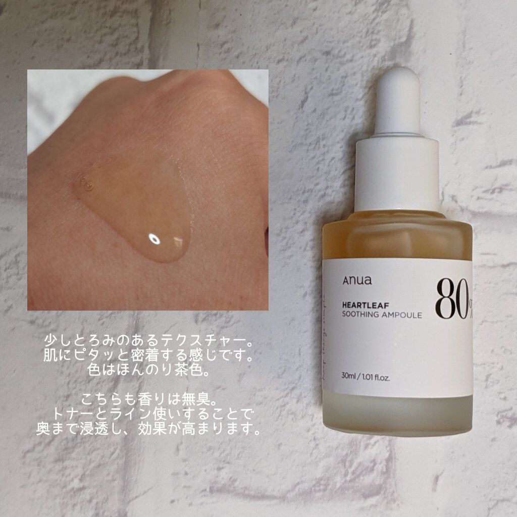 ドクダミエキスを精製水の代わりに77%入れてトラブル鎮静に卓越したトナー。 皮膚刺激テストの結果、「無刺激」判定で敏感肌の方にも安心して使用できます。 水っぽくサラサラとしたテクスチャーで、肌馴染みが良くさっぱりとしています!! 手に出して化粧水として使用したり、コットンにたっぷり染み込ませてパックとして使用するのもおすすめです!😊 ドクダミ成分配合で、肌荒れ時にも使用できて刺激を感じることもなかったです! Anuaのアンプルと一緒に使用すると、より保湿してくれて、お肌を鎮静してくれます!😊