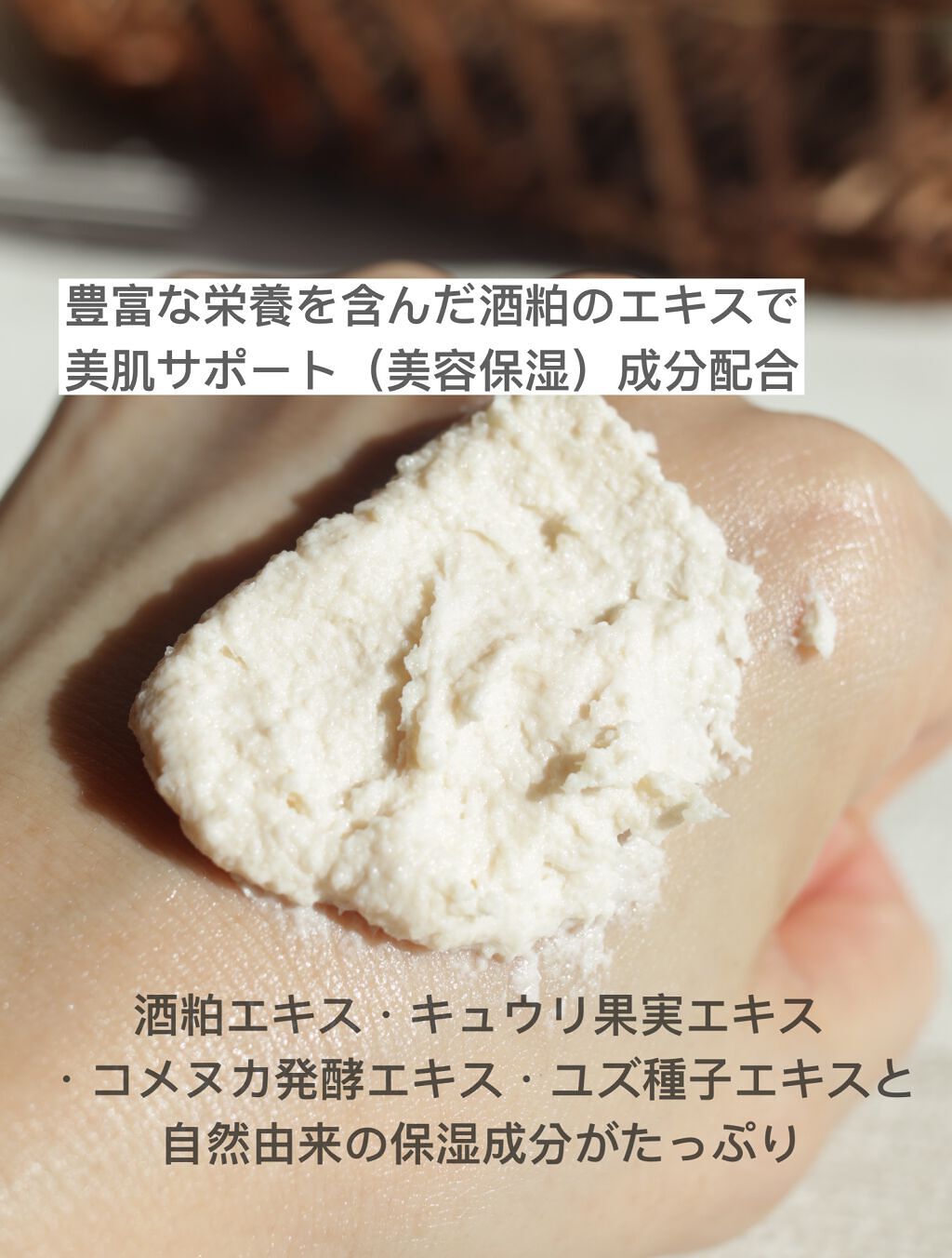 - おうちで簡単に酒粕※2パックが楽しめる、洗い流しパック。 熊本県河津酒造の酒粕から抽出した、オリジナルの酒粕エキスを配合。 ●保湿成分・・・酒粕エキス・キュウリ果実エキス・コメヌカ発酵エキス・ユズ種子エキス ◆透明感のある肌※1へ オリジナル酒粕エキス※2を配合した洗い流しパックで透明感のある肌※1へ ◆熊本県河津酒造の酒粕から抽出した酒粕エキス(保湿成分)配合 ワフードメイドでは、熊本県河津酒造の酒粕から抽出した、オリジナルの酒粕エキスを配合。阿蘇の酒米を中心に国産米を精米し、阿蘇の湧水と熊本酵母(協会9号酵母)を使って、昔ながらの槽搾り製法でやさしく搾られた酒粕のエキスを使用しています。 ◆美肌サポート(美容保湿)成分配合 厳選した原料から抽出した植物エキスをぜいたくに配合。