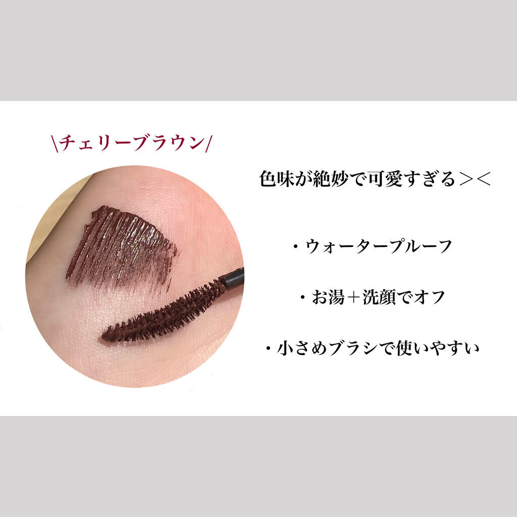 - ずっと上向きまつげ”ふんわりカール”。 まつげにするする絡んでダマにならず、ふんわり上向きまつげを長時間キープ!「お湯+洗顔料」で簡単オフできる、新カールマスカラ。1本1本、根元から美しくセパレートできる、日本人の目幅に合わせた設計幅25.5mmのコンパクトブラシ採用。 ●ブラック ●チェリーブラウン(2021/8/1 全国発売) ほんのり赤みが絶妙なおしゃれカラー。目元をきちんと引締めながら、優しい印象に演出します。 肌なじみ抜群で、シャドウや肌色問わず使いやすい。 ●キャラメルブラウン(2021/12/1 マツモトキヨシ・ココカラファイン・PLAZA・MiNIPLA・LOFTで発売) 顔全体が明るく見えるキャラメル系ブラウン。 ふわっと軽い抜け感で、存在感のある目元を演出する、「盛れる抜け感」を叶えるカラーです。 ●新色【ルビーブラウン】(2022年1月24日発売) 「ほのかに透ける"くすみピンク"」 甘すぎないピンクが濃くなりすぎず、優しい色気を演出。 まばたきする度感じる、上品なピンクニュアンス。 ●マロングレージュ (2022年10月9日発売) ブラックより軽く、ブラウンより洒落る“大人カラー” まつげの存在感を柔らかく際立てる絶妙な発色 ●新色【ピンクブラウン】(2023年2月10日発売) 「ほのかに甘い"優しいピンク"」 ミルクチョコレートのようにまろやかな発色。 “ブラウンベース”で目元に馴染みながらまつげが際立つ。 ●新色【モカベージュ】(2023年4月21日発売) 王道のブラウンよりも“柔らかな存在感 生まれつきの茶色い自まつげを思わせる自然な色づき。 顔から浮かずに盛れる、彩度低めの発色です。 ●新色【プラムブラック】(2023年10月1日発売) ただの黒じゃない。パープルが潜むニュアンスブラック ふとした瞬間に感じる”甘さ”が色っぽい 盛れるのにお洒落、新しい黒マスカラ ※店舗によりお取り扱いが無い場合や、販売開始日が異なる場合がございます。取扱い状況につきましては、お近くの店舗までお問い合わせいただくとスムーズです。