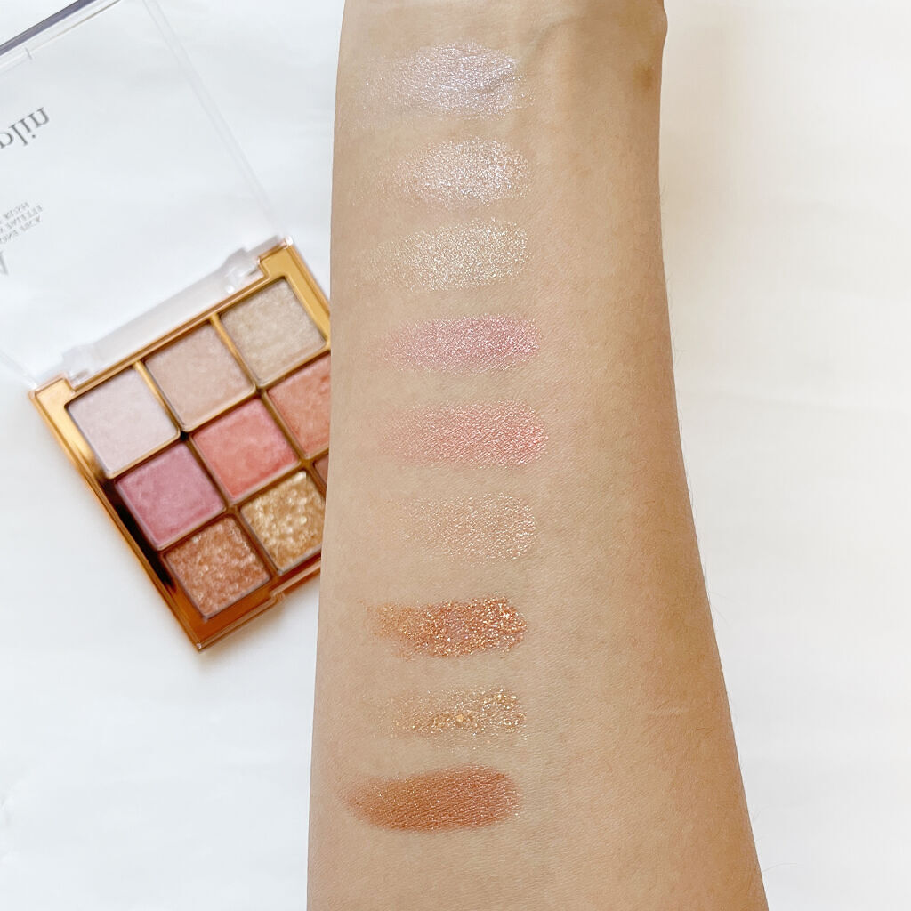 カラーはマットカラーばかりに1つだけグリッターっぽいラメカラーの計10色。 このパレットのカラーは“ムラ感”が出にくくてすごく使いやすい色味です。 クリオはすごく発色がいいので右下の締め色のブラウンも見た目だとちょっと明るめですがまぶたに乗せると深みがあってしっかり締まるカラーです。 マット系のカラーなので最後に他のアイシャドウのラメ感をプラスしても可愛いしマットのままでもまとまりが出てすごく綺麗に仕上がります。