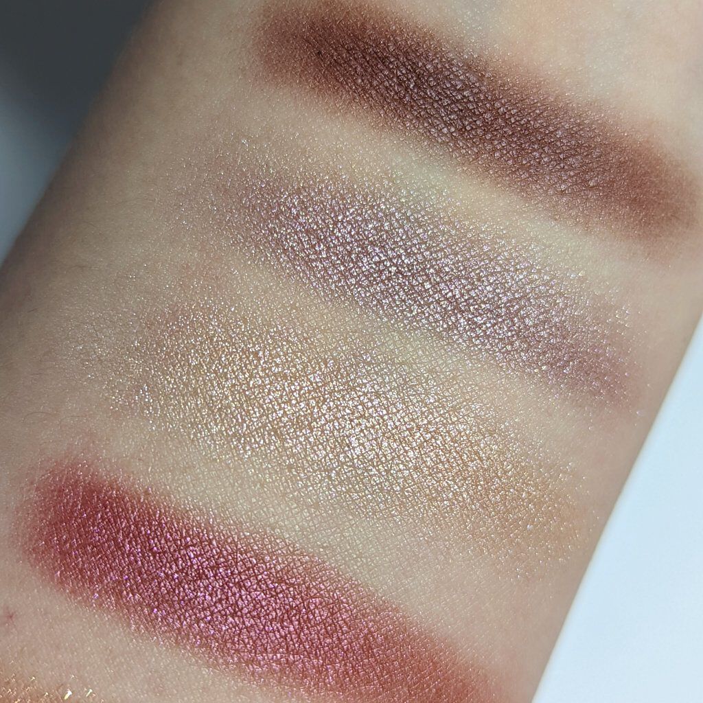 マットの発色をご覧ください。 マットでここまで発色するのって、珍しい。 特にパープル系のマットは、作るのが難しいらしく、ハイブランドでも発色がよくブレンドしやすいマットパープルを作るのに苦労するそう。 ですがこちらのaztkのマットパープルは、一塗りですんごい発色。 しっとりしているわけではないのですが、しっかり密着してくれる感じもします。 逆にパール系は少し発色優しめかな?と思いますが、ニュアンス的に使う分には問題なし。 ラメはギラギラのラメではなくチラチララメで、とっても上品。 いろんなシャドウと組み合わせて無限大にアイメイクが楽しめそうです。