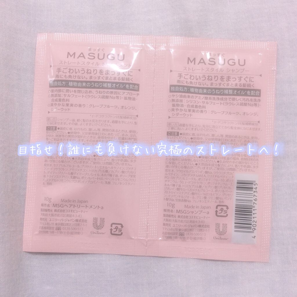 ※2024年使用品シャントリ・商品名MASUGU(まっすぐ)ストレートスタイルシャンプー/トリートメント・値段定価1624円(814円で購入)・購入場所マツキヨ・評価★☆☆☆☆好みじゃなかったシャンプーしゃばしゃば、トリートメントもゆるめ柑橘...