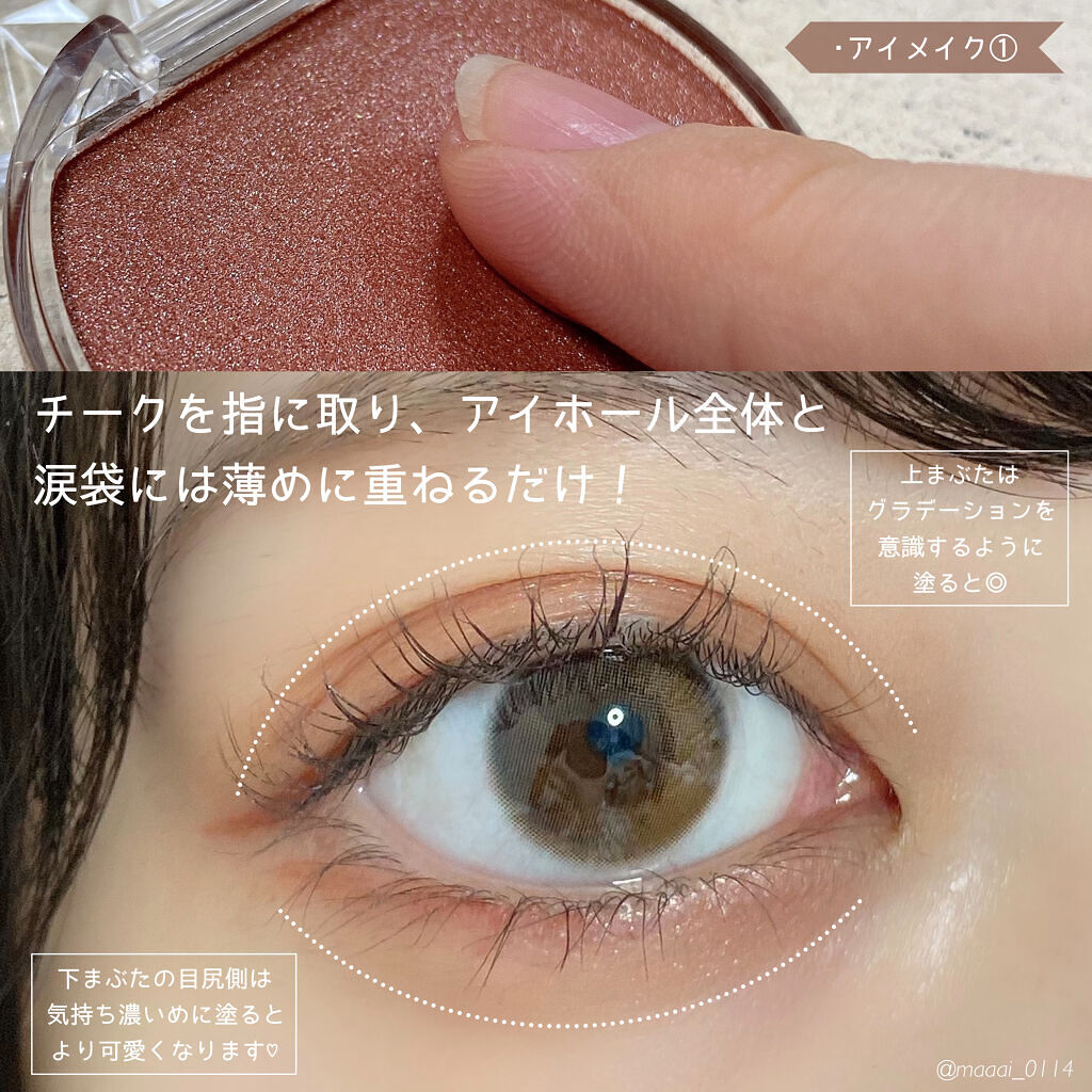 このクリームチークはムニムニとした面白い質感のチークで、 塗ると表面がサラッとするのでアイシャドウとして使ってみました🙌🏻✨ 伸びも良く重ねると濃く出来るようなタイプで、 色味の調節もしやすくグラデーションも作りやすかったです◎