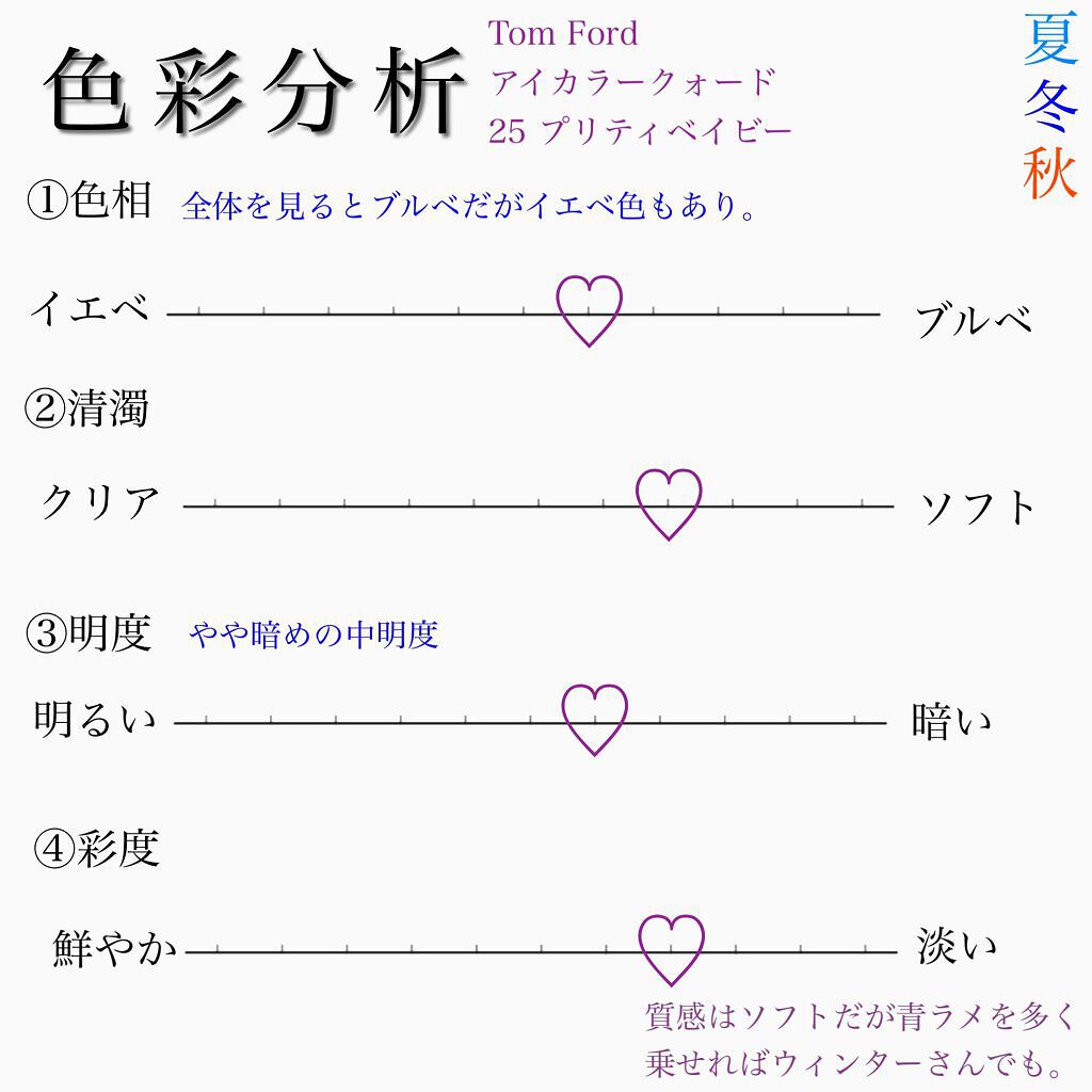 上段左はブルベの陰影を作るのにピッタリなマットシャドウ。ノーズシャドウまでこなせる。 立体的な瞳を作るための「陰」と「光」が1つのパレットになっていて使いやすい。 上段右は紫色に見えるが、ドがつくブルベの私の肌では若干ブラウンっぽく発色する。青み吸収というものです。 ブルベ冬にはくすみが強いので下段メインで使う方が良いかも。