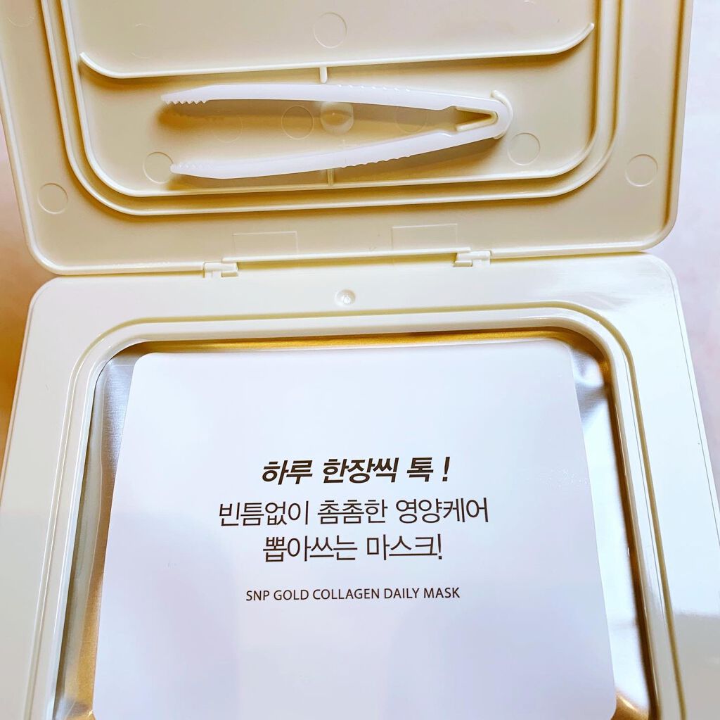 SNP ゴールドコラーゲンデイリーマスクの紹介レビューをしていきます☺︎ ゴールドとコラーゲンの成分で肌に弾力を 肌にしっかり密着するテンセルシートを使用 シワ改善成分配合でツヤのある肌に 30枚入ってるので1ヶ月使えるコスパの良い毎日使えるデイリーマスク マスク自体は最初デイリーマスクだし結構薄めだな〜と思ったんですが肌への密着度がすごくてしっかり保湿もしてくれるので大満足! テンセルシートっていうぴたっと密着するしっかりしたシートでした。 美容液はサラサラなテクスチャー パック後はお肌がもちもちであまりべたつかないのがすごくよかったし私的にこのパックの香りがとても好きでした デイリー使いには充分すぎるマスク!