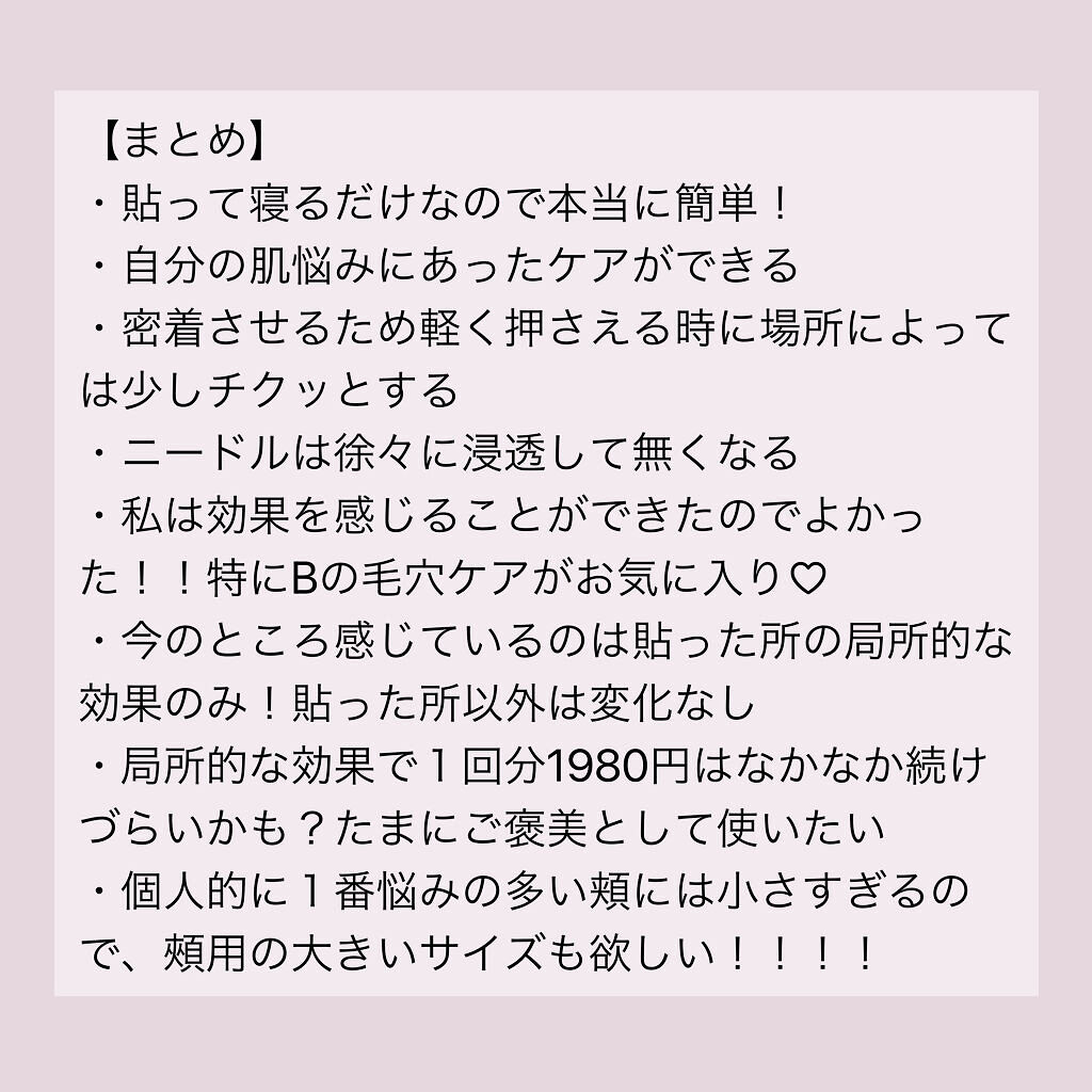 - 肌に合わせて「成分」×「貼る部位」が選べるポイントケア用のスペシャル美容液シリーズ。 成分を効率よく届けるマイクロニードルパッチで、頬・眉間・顎などお好きな部位を集中ケアできます。