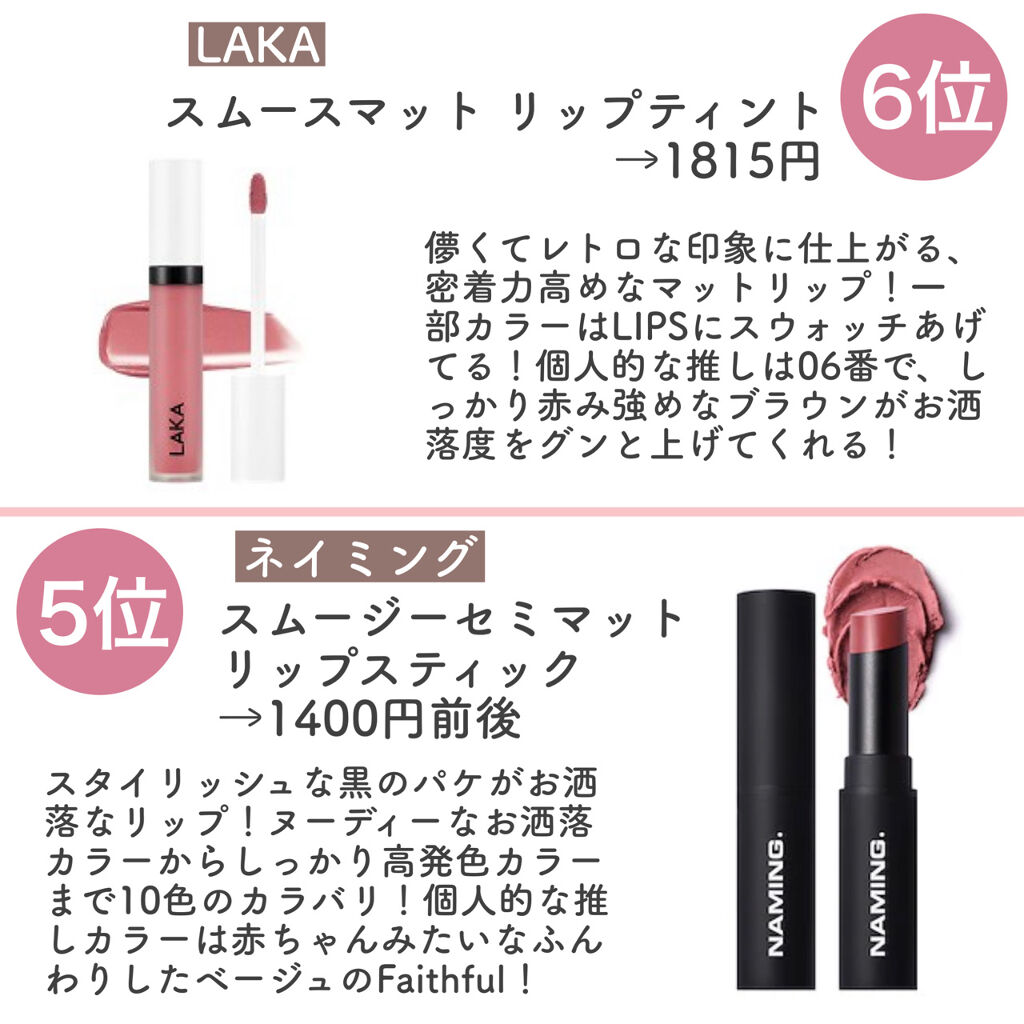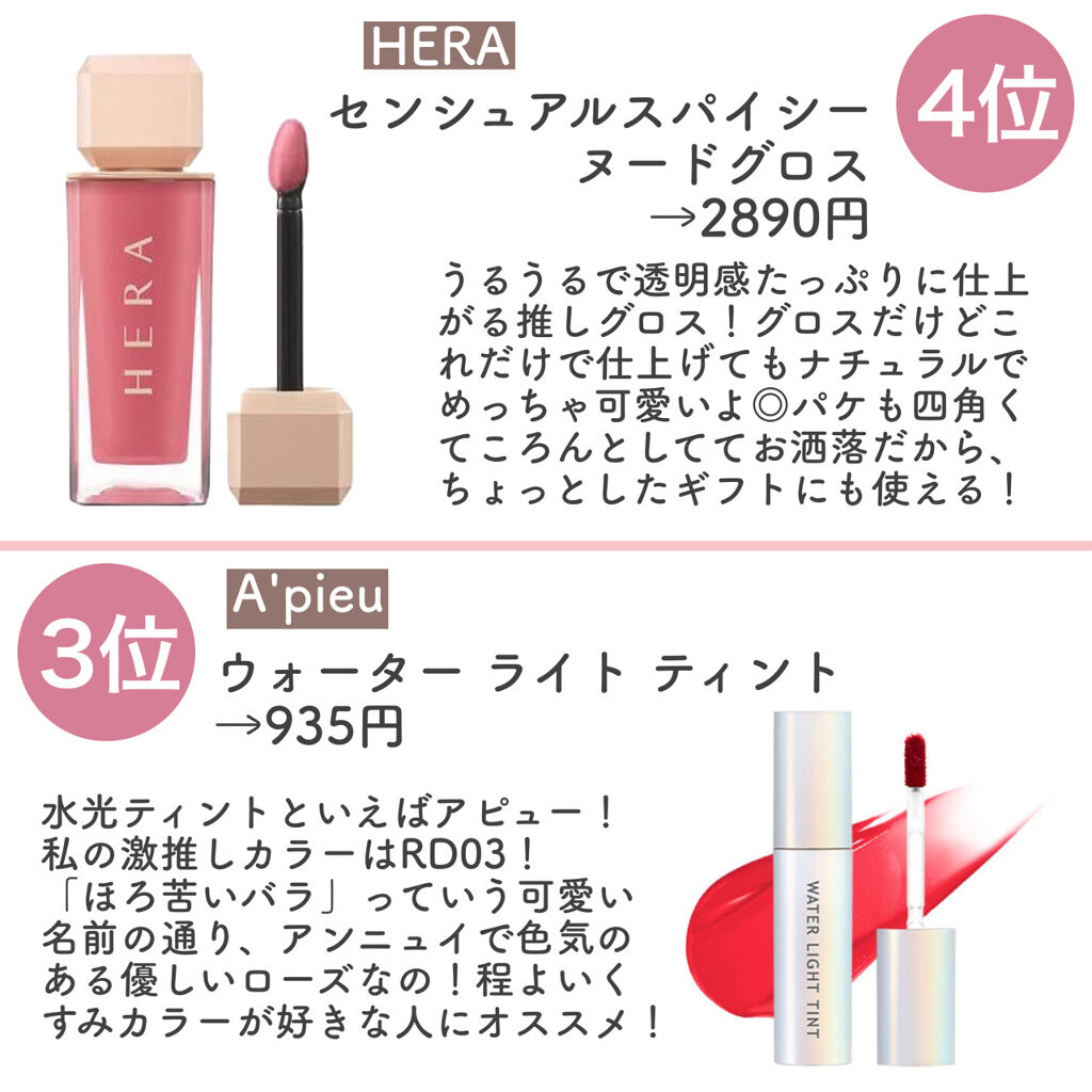 | リップティントランキング第49位 | 唇にピタッと密着しているような感じがあり、なじみが良い 1度塗りだと薄づきでナチュラルな発色になり、塗り重ねていくとしっかり発色して可愛い | 詳細を見る | |