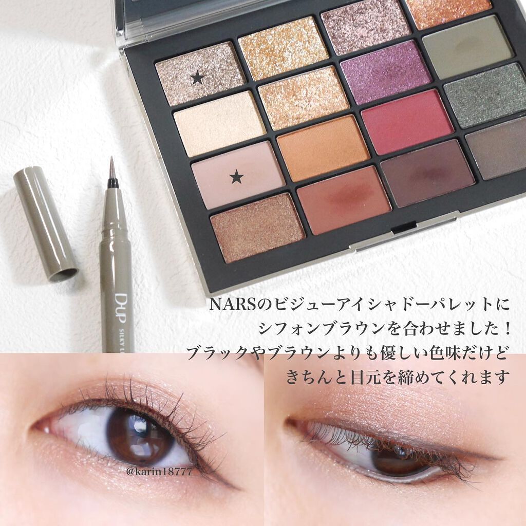 - 筆先までずっとなめらか、目尻で感動するリキッドアイライナー。 必要な量が肌にのる新設計で、まぶたの上をすべるような、滑らかな描き心地。しなやかでコシのある筆が、筆圧のコントロールを容易にし、太いラインも細いラインも思い通りに仕上げます。水、汗、涙に強いウォータープルーフタイプなのに、通常洗顔で簡単オフ。肌に色素が残らない顔料を使用。5種類の美容液成分を従来品の200%配合し、メイクしながら目元ケアまで。 ●ブラウンブラック ※2020年9月12日 バラエティショップ先行発売 ●漆黒ブラック ※2020年12月頃発売予定 ●ナチュラルブラウン ※2020年12月頃発売予定 ●シフォンブラウン 「毎日メイクに透明感と抜け感」 ブラウンでも、グレーでも、ベージュでもないニュアンスカラー。 自然な印影で素の目元を際立て、頑張りすぎない、ふんわりとした目元に。 ●アプリコットブラウン 「じゅわっと血色感。 肌に馴染むおしゃれカラー」 温かみのあるアプリコットがじゅわっと滲む血色感を目元に演出。 肌馴染みが良いので、カラーライナーに抵抗がある方もブラウンの延長線上で楽しめる、使いやすい色味です。 ”ちょっとオシャレ”な空気感を演出するカラー。 ●ピンクショコラ アイライナー 「ピンクが溶け込む濃厚ブラウン」 肌馴染みが良く、目元にじんわり血色感をプラス。 さりげなく女性らしさが加速するようなカラー。 ●ピスタチオラテ (2022年7月29日(金)発売) 「“目尻”に抜け感アクセント」 肌に馴染むのに映える絶妙なグリーン。 トレンドカラーに“くすみ”と“抜け感”をプラスしたまろやかな発色。 ●マスタードブラウン 「“イエロー”が揺れる、大人の洒落色」 (2022年7月29日(金)発売) まるで太陽のような暖かさを感じる新しいブラウン。 ほんのり感じるイエローでメイクが一気に垢抜ける稀有な色。 ●シフォンピンク(2023年2月10日発売) 「ふんわり柔らか"まろみピンク"」 甘くなりすぎない青みニュアンスで目元の透明感UP。 目元を引き締め、ピンクメイクにありがちな腫れぼったさを解消。 ●ミルクカプチーノ(2023年4月21日発売) まろやかな深みの“優しい締め色” どんなメイクにも合わせやすいカラー。 自然な陰影でさりげなく目幅を拡張します。 ●グレーカシミア(2023年10月1日発売) ブラウンがほんのり溶け込んだ、暖色グレー まろやかな発色で、パーソナルカラーを問わず肌に馴染む 目元の陰影になりすまし、抜け感と目力を欲張りに叶える ●ダークフィグ(2024年6月1日発売) するする”なめらか。描きやすいのに、落ちにくい。 クッキリ可愛いほの甘ダークブラウン ●ピーチモカ(2024年8月1日発売) ふわっと自然に盛れる“桃色ブラウン” ほんのり血色感で目元にうるみ感を演出 ●スターダストブラウン(2024年12月11日発売) キラッと繊細に輝く''星屑ブラウン'' 透け感のあるダークブラウンの色味とラメの輝きが、目元に艶のある立体感を演出 ●チャコールモカ(2025年4月10日発売) 目元を締める''深みグレージュ'' 黄みや赤みに偏りすぎない絶妙な色設計で、自然に目元を強調