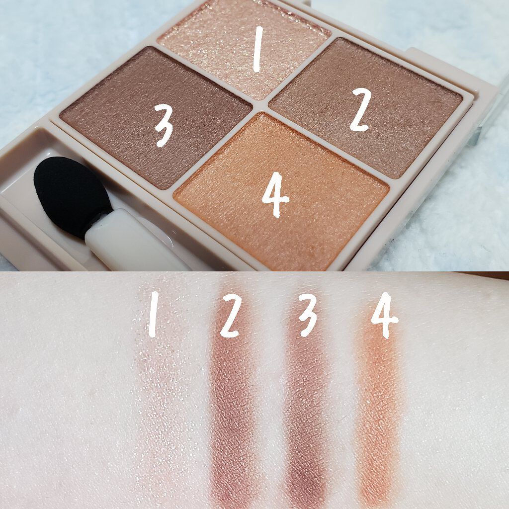 - シルキースフレアイズの姉妹品♡ 肌に溶け込むような透けマットシャドウ 透け感のある柔らかい仕上がりになるマット3色と、透け発色の繊細ラメ1色のパレットシャドウ♡ 完全マットアイや、ラメ×マットアイなど、メイクのパターンを楽しみましょう!