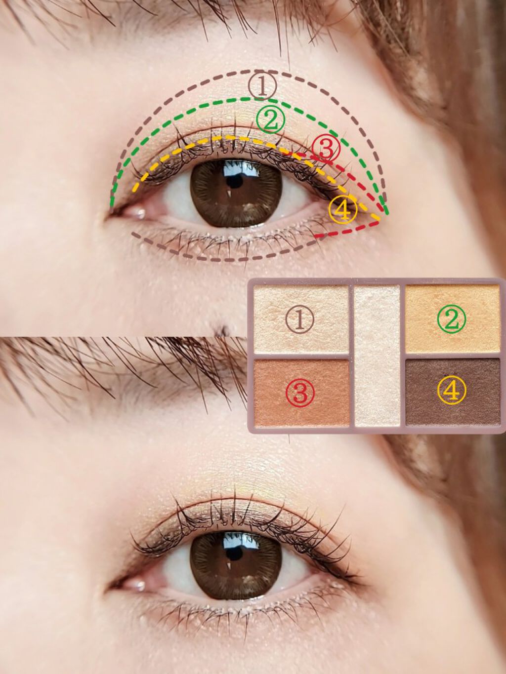- 1枚のパレットで2つのスタイルが完成! 5色の欲ばりアイシャドウ♥ メインカラーを選んで2つのスタイルが楽しめる! A→B→D でスタイル1 A→C→D でスタイル2 繊細な粉質が、しっとりとまぶたに密着して色落ちを防ぎます。 透明感のあるキラうるトッピングジュエル(繊細ラメ)は、気分によってトッピング!