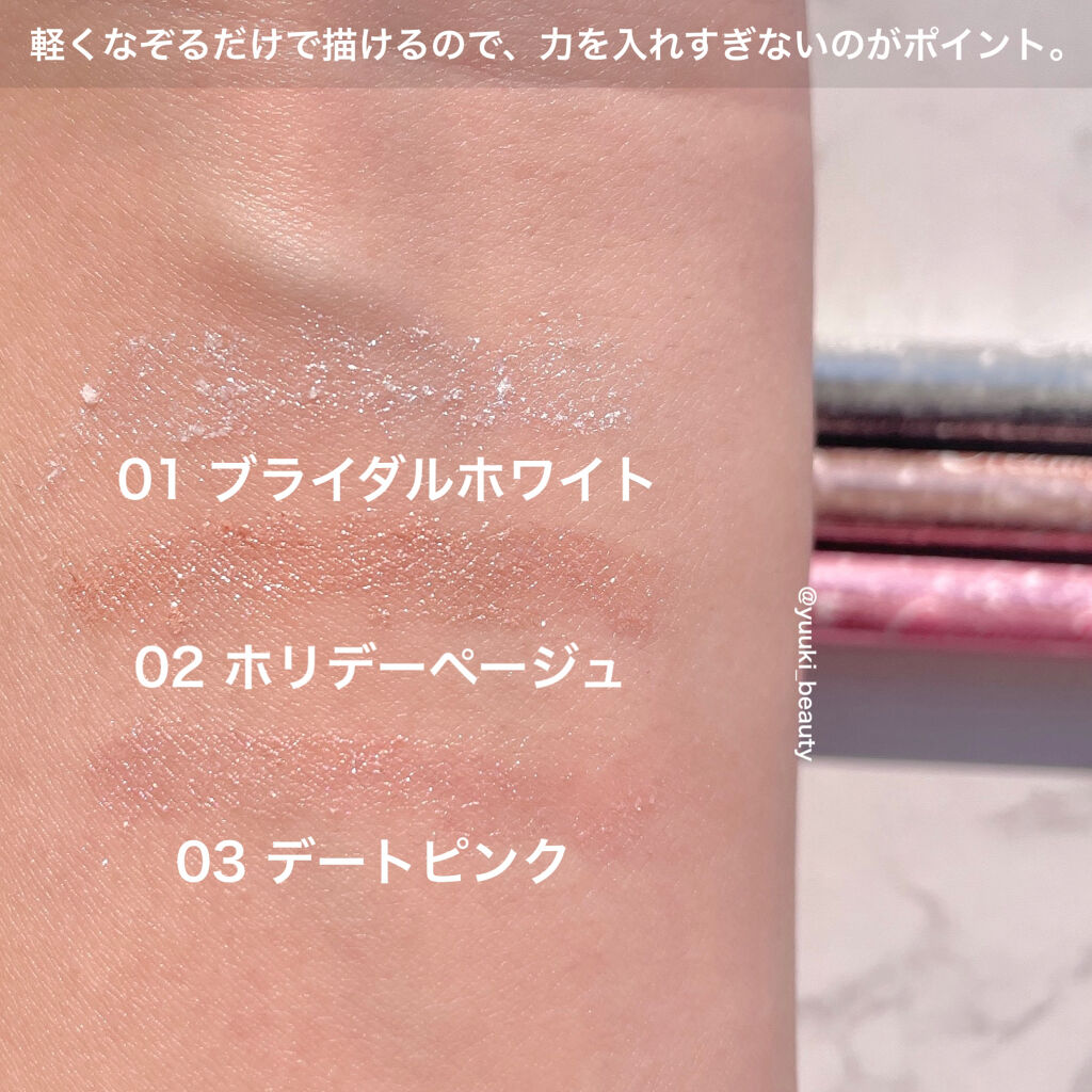 - とろける描き心地の極細ラメシャドウが限定新登場★ 下まぶたメイクを楽しむ✨ ピンポイントでラメラインを入れられる極細ラメシャドウ! 2mmの細芯で小回りが利くので細いラインが簡単に描ける♪ 柔らか芯なので、肌当たりはとても優しく、アイシャドウチップでのせるよりも手軽にラメラインが描けるアイテムです! 1度描きでしっかりキラキラする高輝度ラメで、重ね描きは不要* 1度乾いて密着すればとにかく落ちにくい✨水・汗・涙に強いウォータープルーフ処方!描きたての仕上がりを長時間キープ★