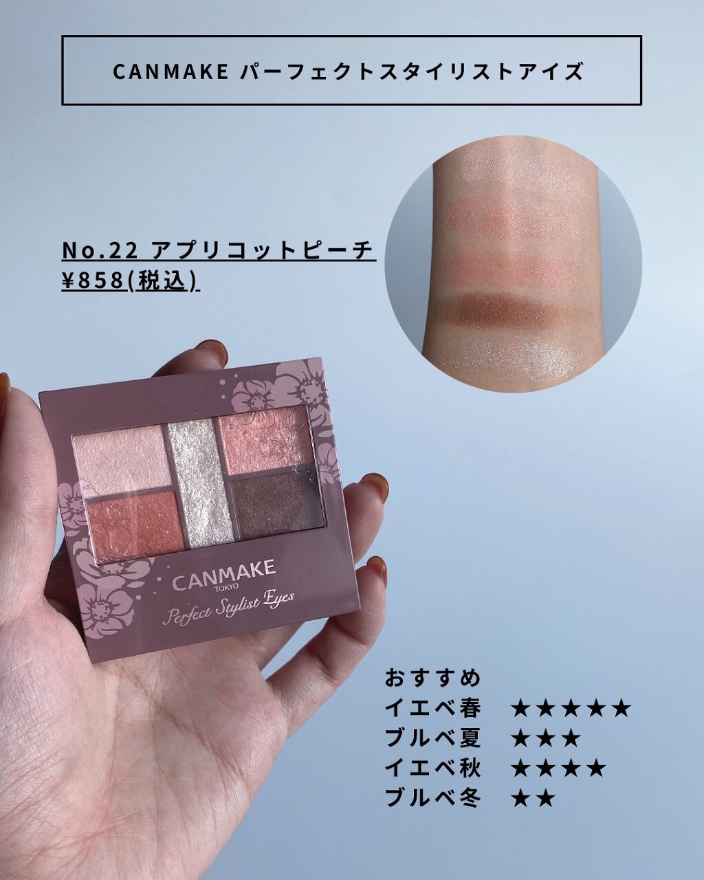 キャンメイクのパーフェクトスタイリストアイズ、No.22アプリコットピーチを購入しました!右下のカラーと真ん中以外はコーラル寄りのピンクで、発色は薄めです。全てのカラーにパールやラメが入っていて、真ん中のカラーが大きめのラメで、右下のブラウン...