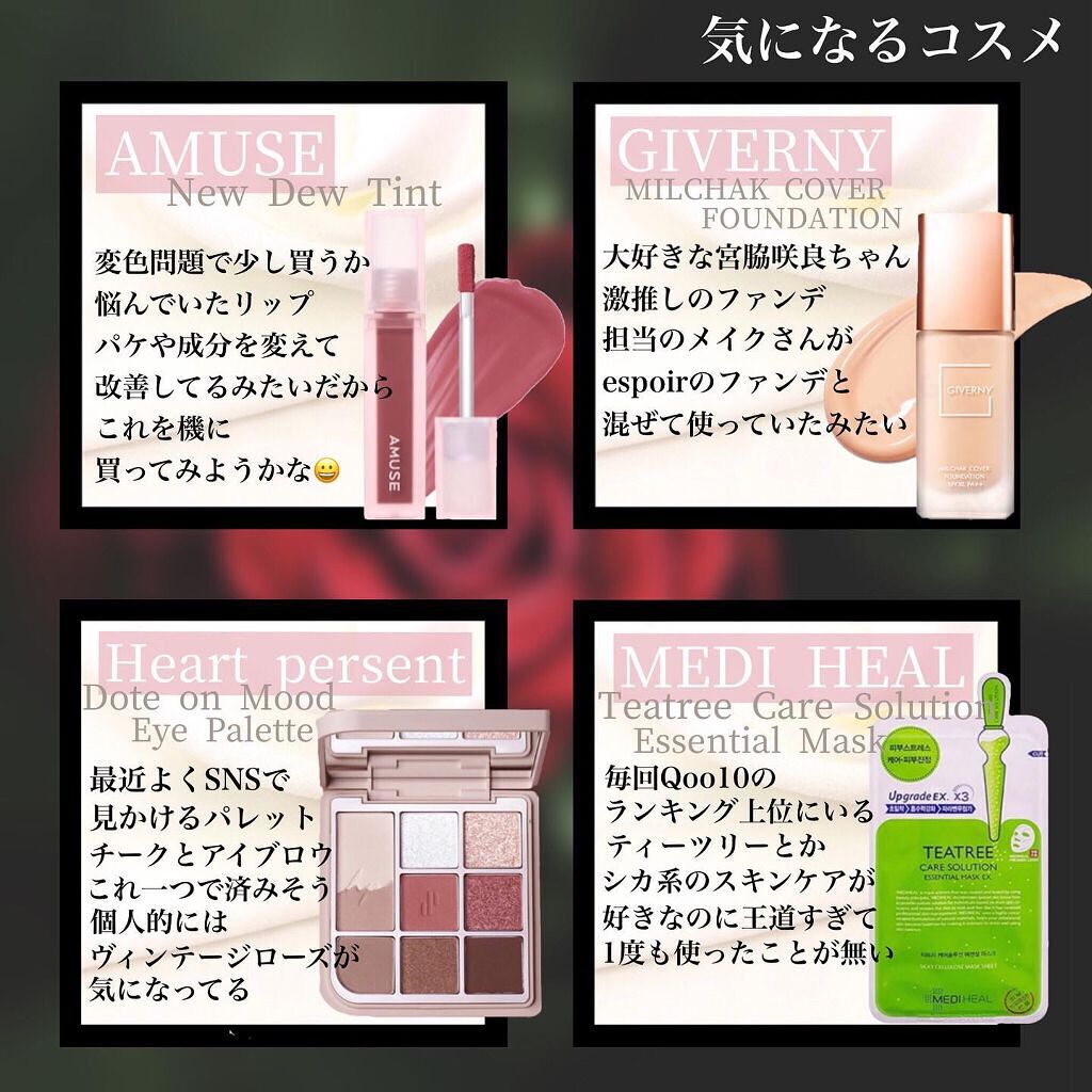 目の周りの3箇所は特にハイライトを部分的に入れることで光が入って顔全体がパッと明るくなるような気がします😗😗 本当はグロスを使いたいけどマスクに付いた時の不快感が嫌なのでサラサラ系のテクスチャーのティントがおすすめ▹▸宮脇咲良プロデュースのCran by Molakブルームジェリーティントは名前の通りジェルっぽい質感でツヤっとした仕上がりになるので良い◎ 顔の中心にはパウダーをのせずにファンデーションのツヤをそのままの残した方が太陽の光が当たった時自然な輝きが出て好き🙂輪郭は擦れでメイクが落ちやすいのでおでこも含めてしっかりパウダーで抑えます👌🏻(鼻周りが落ちやすい方はそこだけパウダーで抑えてもいいかも)