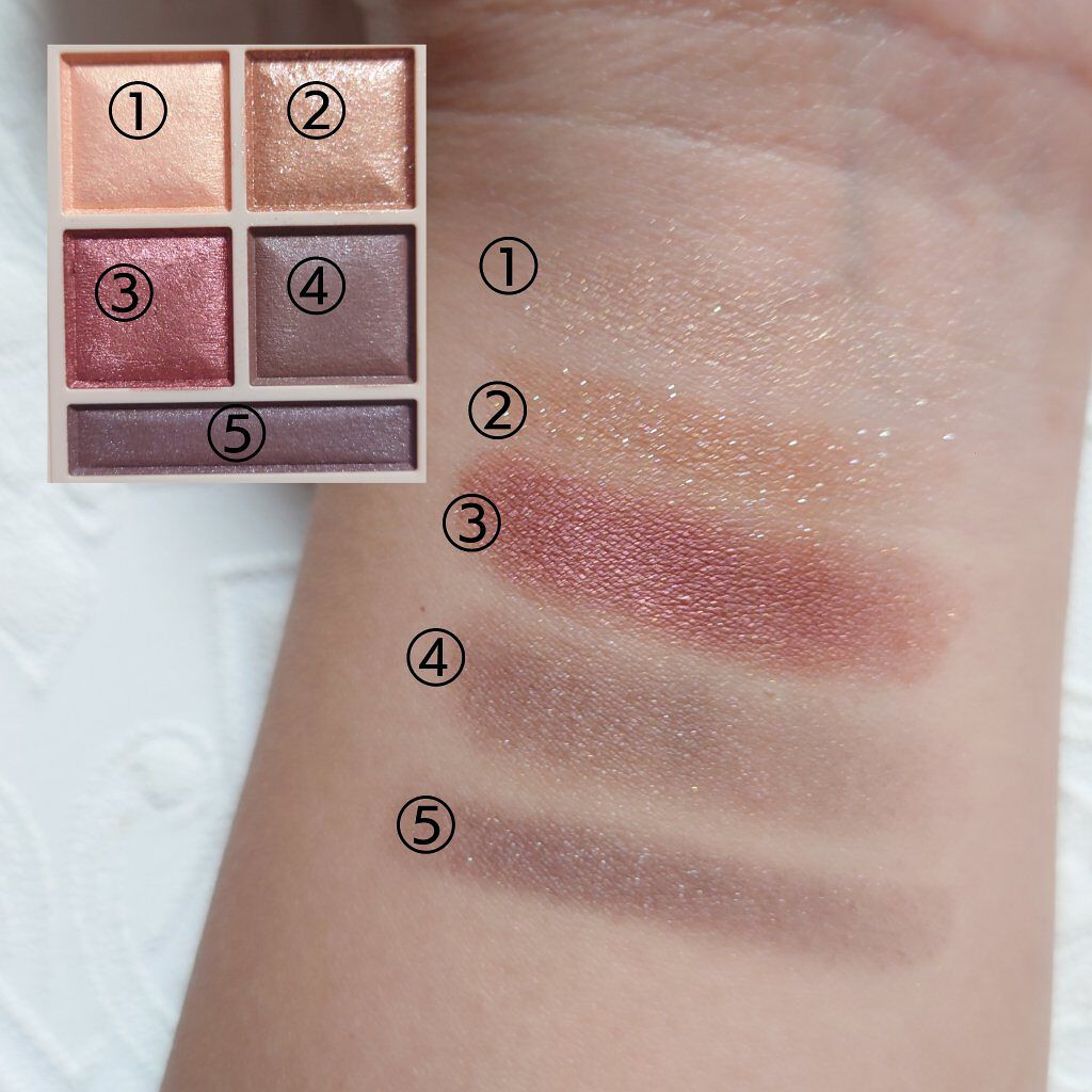 ブルベ向けヌードパレットというだけあって、上の段のピンクも下の段のブラウンも優しい発色。 粉質はサラッサラです。 サラサラですが密着はしっかりしてくれるので、色持ちは悪くないです。 優しくふわっと仕上げたいときにぴったりのパレット。