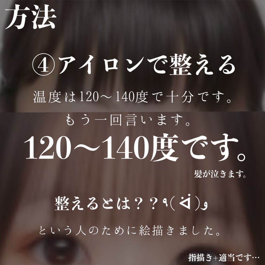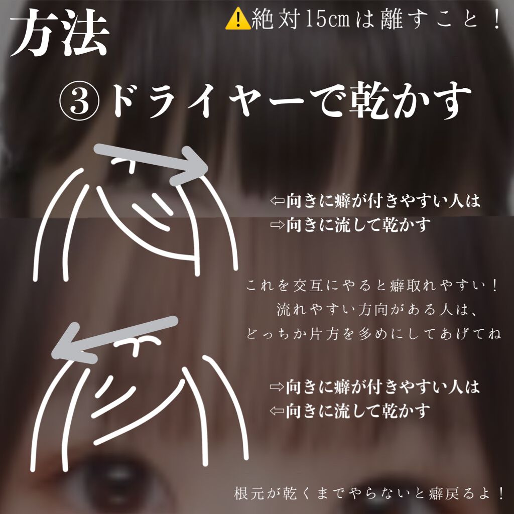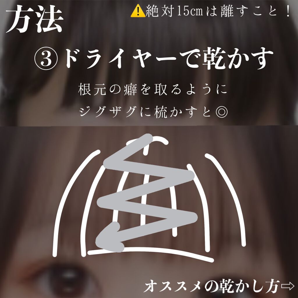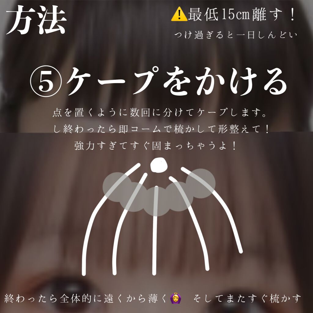 写真にも載せていますが、下にもう少し詳しく載せていますので参考にしてください💕 前髪をくしで梳かす 寝てる間についてしまった埃を取りましょう! ドライヤーで乾かす オススメはジグザグか、左右に優しく引っ張りながら梳かして乾かす方法です! アイロンをする 毛先だけくるんってするのが個人的に可愛い🥰 ケープをつける 前髪の付け根より少し下くらいに、点を置くようにつけます! ドライヤーで乾かす 下から支えながら!形を固定させます☺️