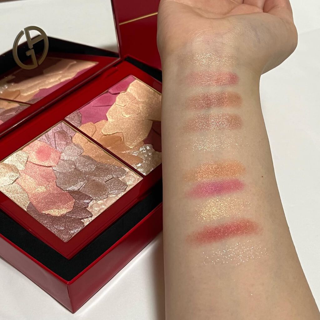 - ジュエリーにインスパイアされたエレガントでフェスティブ感あふれるアイコニックなパレット。アイシャドウ、ライナー、ブラッシュ、ブロンザー、ハイライターすべてが1つのパレットに。アルマーニ氏のカラーフィロソフィーである「ピュアなピグメントと軽やかなテクスチャーの融合」を踏襲し、輝きを放ち、暗くならないシェードを揃えました。