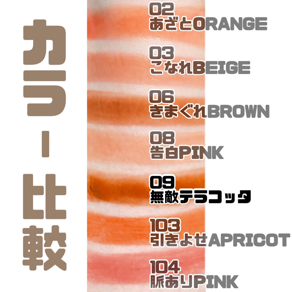- <01 こなれBEIGE【新】> リンゴ酸ジイソステアリル、ダイマージリノール酸ダイマージリノレイルビス(ベヘニル/イソステアリル/フィトステリル)、(アジピン酸/カプリン酸/カプリル酸/ヘプタン酸)ペンタエリスリチル、(VP/ヘキサデセン)コポリマー、ビスジグリセリルポリアシルアジペート-2、パラフィン、オクチルドデカノール、乳酸メンチル、マイクロクリスタリンワックス、1,2-ヘキサンジオール、イソステアリン酸ソルビタン、酸化チタン、酸化鉄、合成ワックス、セチルPEG/PPG-10/1ジメチコン、ジステアルジモニウムヘクトライト、酢酸トコフェロール、香料、炭酸プロピレン、赤202、リモネン、トリエトキシカプリリルシラン、リナロール、シトラール、ホホバ種子油、ヒアルロン酸Na、アルガニアスピノサ核油 <02 告白PINK【新】> リンゴ酸ジイソステアリル、ダイマージリノール酸ダイマージリノレイルビス(ベヘニル/イソステアリル/フィトステリル)、(アジピン酸/カプリン酸/カプリル酸/ヘプタン酸)ペンタエリスリチル、ビスジグリセリルポリアシルアジペート-2、(VP/ヘキサデセン)コポリマー、パラフィン、オクチルドデカノール、乳酸メンチル、マイクロクリスタリンワックス、1,2-ヘキサンジオール、イソステアリン酸ソルビタン、酸化チタン、合成ワックス、セチルPEG/PPG-10/1ジメチコン、ジステアルジモニウムヘクトライト、赤202、酢酸トコフェロール、香料、⻩5、炭酸プロピレン、⻘1、リモネン、リナロール、シトラール、アルガニアスピノサ核油、ホホバ種子油、ヒアルロン酸Na <03 きまぐれBROWN【新】> リンゴ酸ジイソステアリル、ダイマージリノール酸ダイマージリノレイルビス(ベヘニル/イソステアリル/フィトステリル)、(アジピン酸/カプリン酸/カプリル酸/ヘプタン酸)ペンタエリスリチル、(VP/ヘキサデセン)コポリマー、ビスジグリセリルポリアシルアジペート-2、パラフィン、オクチルドデカノール、乳酸メンチル、マイクロクリスタリンワックス、1,2-ヘキサンジオール、イソステアリン酸ソルビタン、酸化鉄、酸化チタン、合成ワックス、セチルPEG/PPG-10/1ジメチコン、ジステアルジモニウムヘクトライト、酢酸トコフェロール、香料、炭酸プロピレン、赤104(1)、リモネン、リナロール、シトラール、ホホバ種子油、ヒアルロン酸Na、アルガニアスピノサ核油 <04 愛されPINK【新】> リンゴ酸ジイソステアリル、ダイマージリノール酸ダイマージリノレイルビス(ベヘニル/イソステアリル/フィトステリル)、(アジピン酸/カプリン酸/カプリル酸/ヘプタン酸)ペンタエリスリチル、(VP/ヘキサデセン)コポリマー、ビスジグリセリルポリアシルアジペート-2、パラフィン、オクチルドデカノール、乳酸メンチル、マイクロクリスタリンワックス、1,2-ヘキサンジオール、イソステアリン酸ソルビタン、酸化チタン、合成ワックス、セチルPEG/PPG-10/1ジメチコン、ジステアルジモニウムヘクトライト、酸化鉄、酢酸トコフェロール、香料、赤202、黄4、炭酸プロピレン、リモネン、リナロール、シトラール、アルガニアスピノサ核油、ホホバ種子油、ヒアルロン酸Na <05 無敵テラコッタ【新】> リンゴ酸ジイソステアリル、ダイマージリノール酸ダイマージリノレイルビス(ベヘニル/イソステアリル/フィトステリル)、(アジピン酸/カプリン酸/カプリル酸/ヘプタン酸)ペンタエリスリチル、(VP/ヘキサデセン)コポリマー、ビスジグリセリルポリアシルアジペート-2、パラフィン、オクチルドデカノール、乳酸メンチル、マイクロクリスタリンワックス、酸化鉄、1,2-ヘキサンジオール、イソステアリン酸ソルビタン、セチルPEG/PPG-10/1ジメチコン、合成ワックス、酸化チタン、ジステアルジモニウムヘクトライト、酢酸トコフェロール、香料、炭酸プロピレン、リモネン、トリエトキシカプリリルシラン、リナロール、シトラール、ホホバ種子油、ヒアルロン酸Na、アルガニアスピノサ核油 <06 脈ありPINK【新】> リンゴ酸ジイソステアリル、ダイマージリノール酸ダイマージリノレイルビス(ベヘニル/イソステアリル/フィトステリル)、(アジピン酸/カプリン酸/カプリル酸/ヘプタン酸)ペンタエリスリチル、(VP/ヘキサデセン)コポリマー、ビスジグリセリルポリアシルアジペート-2、パラフィン、オクチルドデカノール、乳酸メンチル、マイクロクリスタリンワックス、1,2-ヘキサンジオール、イソステアリン酸ソルビタン、酸化チタン、酸化鉄、合成ワックス、セチルPEG/PPG-10/1ジメチコン、ジステアルジモニウムヘクトライト、酢酸トコフェロール、香料、炭酸プロピレン、赤202、リモネン、リナロール、シトラール、ホホバ種子油、ヒアルロン酸Na、アルガニアスピノサ核油 <07 惚れさせCASSIS【新】> リンゴ酸ジイソステアリル、ダイマージリノール酸ダイマージリノレイルビス(ベヘニル/イソステアリル/フィトステリル)、(アジピン酸/カプリン酸/カプリル酸/ヘプタン酸)ペンタエリスリチル、ビスジグリセリルポリアシルアジペート-2、(VP/ヘキサデ