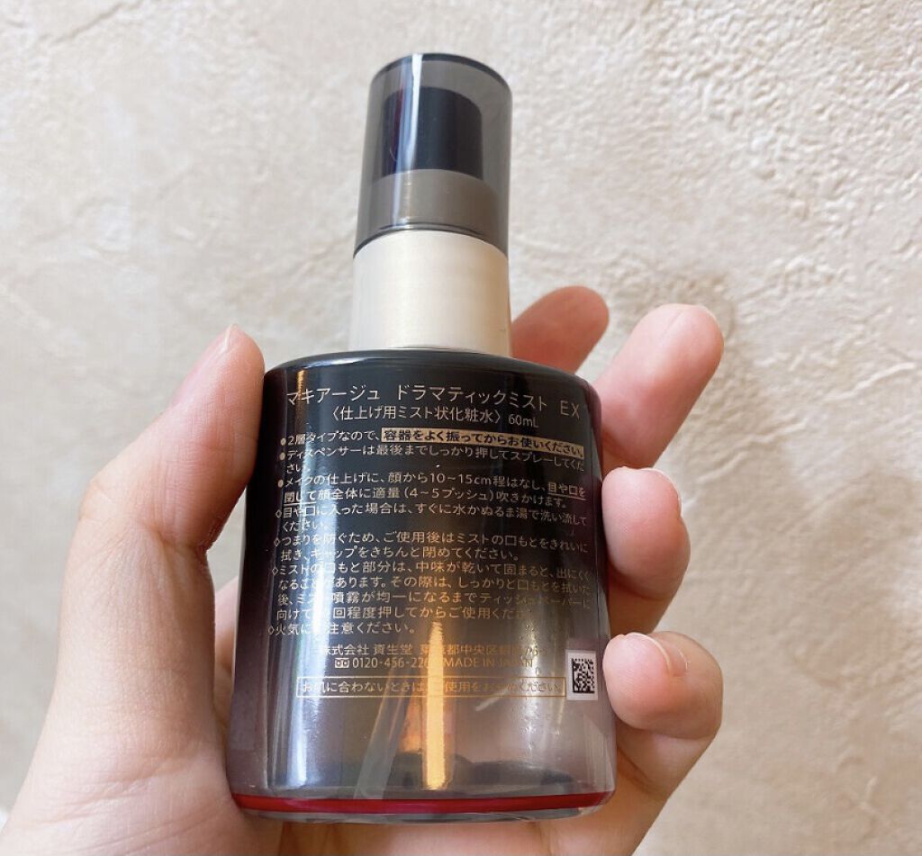 - <ドラマティックミスト EX> 水、エタノール、ジメチコン、(トリメチルシロキシケイ酸/ジメチコノール)クロスポリマー、グリセリン、ジフェニルシロキシフェニルトリメチコン、塩化Na、ラウリルベタイン、カニナバラ果実エキス、シャクヤク根エキス、アセチルヒアルロン酸Na、水溶性コラーゲン、BG、クエン酸Na、メタリン酸Na、クエン酸、ピロ亜硫酸Na、ミリスチン酸イソプロピル、トリフルオロアルキルジメチルトリメチルシロキシケイ酸、フェノキシエタノール、安息香酸Na、安息香酸、香料