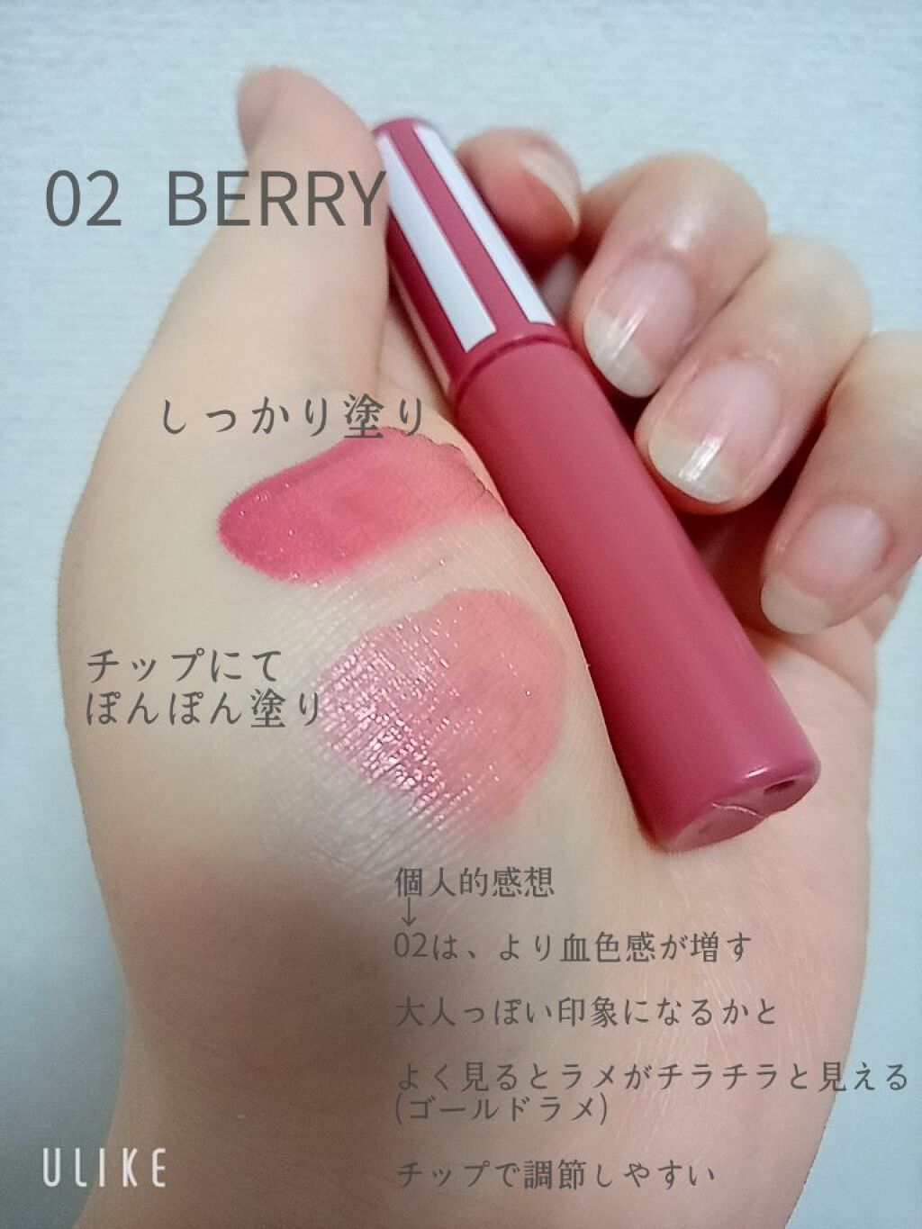 - 誰でも簡単リキッドレシピ レシピ①#血色感リキッド ムラにならないリキッドチーク ★商品POINT★ ①こだわりの肌なじみ処方 ムラにならずにお肌になじむように原料の配合バランスまで計算しつくされたテクスチャーだから、 べたつかずきれいになじんでピタッと密着。指で簡単にぼかしやすいのに、塗りたてのカラーが長続き♡ ②〝透明感引き立て”カラー ほんの少しだけ透明感のブルーをプラス。肌を一番明るくきれいに見せられるよう計算されたカラーで、 ベースメイクの透明感を生かしながらさらにお肌と顔全体の印象を明るくトーンアップし、透明感をプラス。 【01 ピンク】 キュートで甘めな印象に♡ 【02 ベリー】 ちょっぴり大人な印象に♡ 【03 モカ】 ヘルシーではかなげな印象に♡