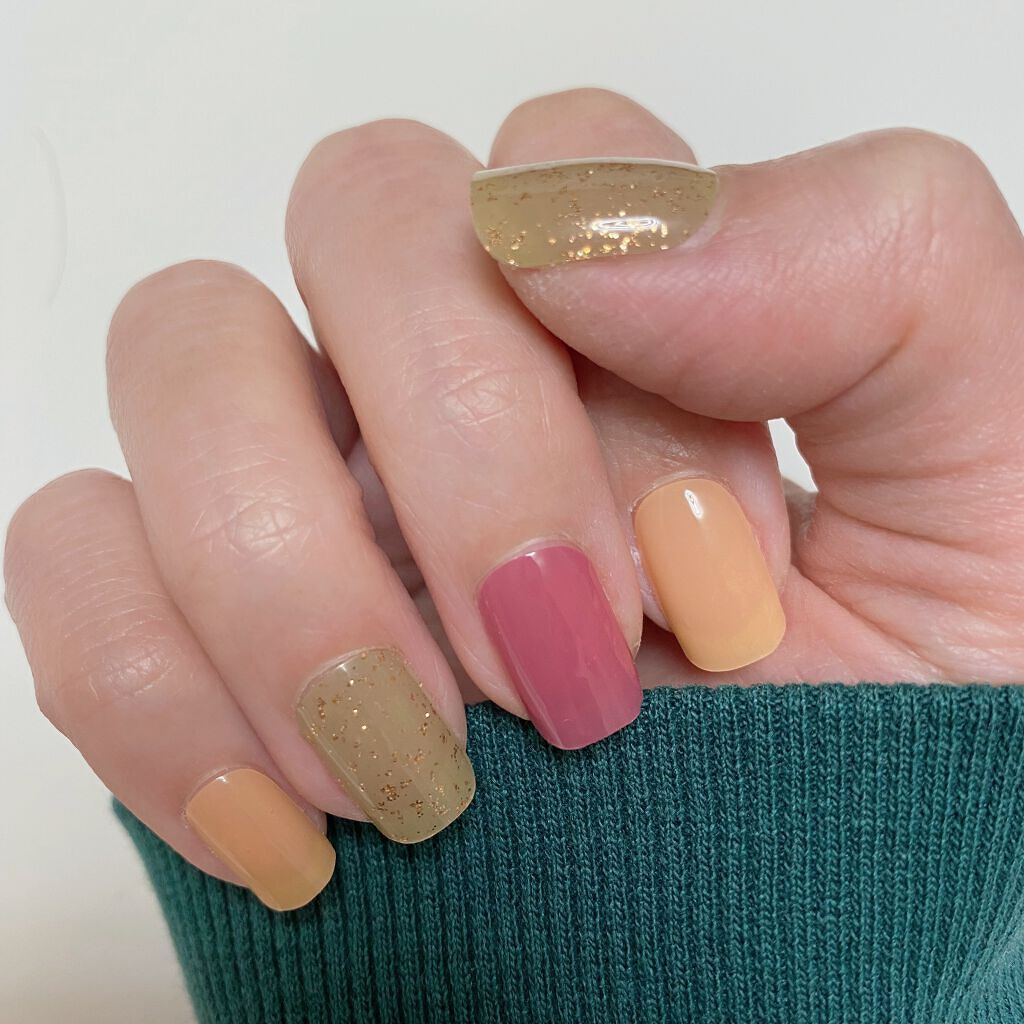 ゜゚*+:。.。:+*゚゜゚*+:。.。.。:+*゚゜゚*+:。.。:+*゚゜ なんとなく秋ネイルピールオフのジェルネイルベースを塗って、セルフネイルしました💅🏻✨飽きたらお風呂の中でペリっと剥がせます。シェルを埋め込んで去り行く夏...