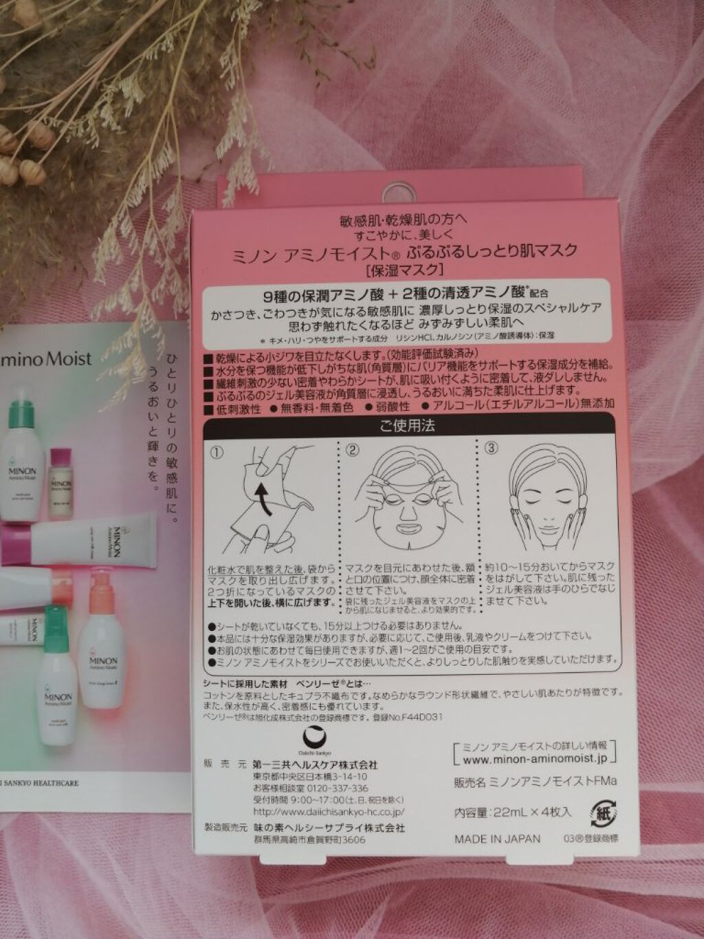 - 思わず触れたくなるほどみずみずしい肌へ。うるおって透明感。 乾燥による小ジワを目立たなくします(効能評価試験済み) 水分を保つ機能が低下しがちな角質層に、バリア機能をサポートする保湿成分を補給 ぷるぷるジェルがしみこんだ密着やわらかシートで、液ダレしません ◎ミノン アミノモイストのシートマスクは化粧水で肌を整えた後にお使いいただく「美容液マスク」です。 週に1-2回のスペシャルケアとしておすすめです♪