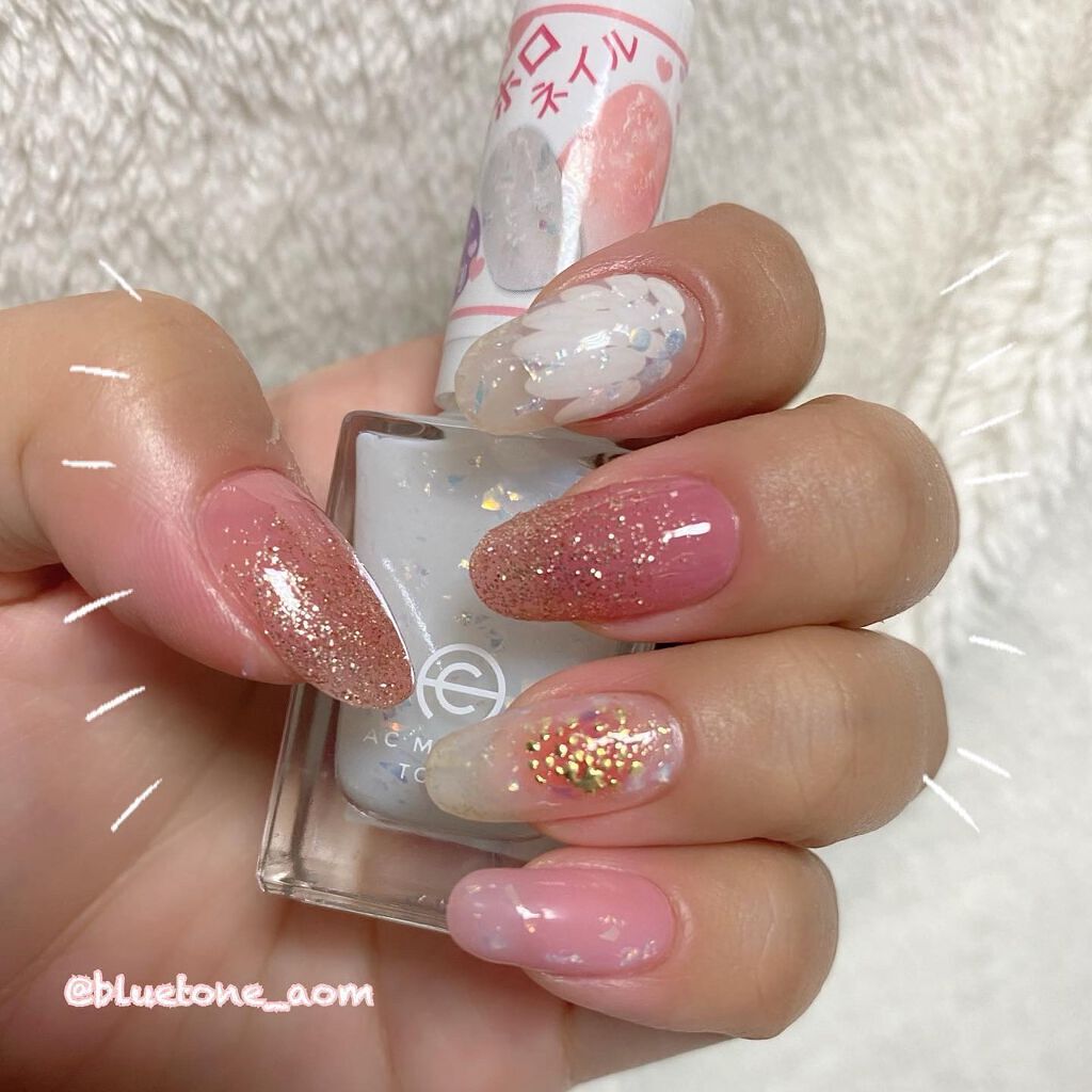 ラメがしっかりしてるし クリアカラーが入ってるから オーロラパウダー無しでも 充分キラキラしました! 反射強めのフィルムなので 実物はもっと うるうるとキラキラが強いです! ビー玉みたい🥺 ネイルシール長持ちさせたいけど ちょっと飽きてきたな〜って時とかに 全然違った印象になるのでオススメです! Seriaのベースジェル 本当にうるうるネイルしやすいので オススメしたい🙆♀️