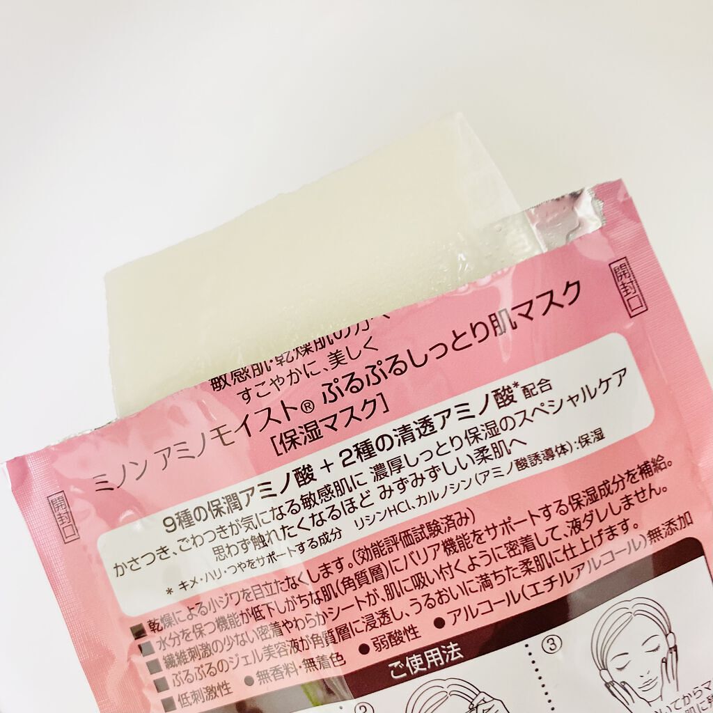 - 思わず触れたくなるほどみずみずしい肌へ。うるおって透明感。 乾燥による小ジワを目立たなくします(効能評価試験済み) 水分を保つ機能が低下しがちな角質層に、バリア機能をサポートする保湿成分を補給 ぷるぷるジェルがしみこんだ密着やわらかシートで、液ダレしません ◎ミノン アミノモイストのシートマスクは化粧水で肌を整えた後にお使いいただく「美容液マスク」です。 週に1-2回のスペシャルケアとしておすすめです♪
