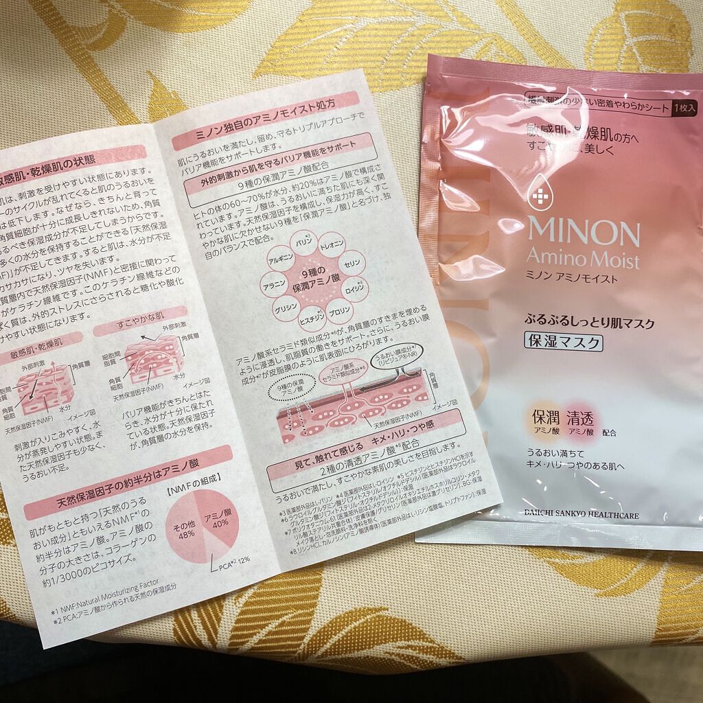 - 思わず触れたくなるほどみずみずしい肌へ。うるおって透明感。 乾燥による小ジワを目立たなくします(効能評価試験済み) 水分を保つ機能が低下しがちな角質層に、バリア機能をサポートする保湿成分を補給 ぷるぷるジェルがしみこんだ密着やわらかシートで、液ダレしません ◎ミノン アミノモイストのシートマスクは化粧水で肌を整えた後にお使いいただく「美容液マスク」です。 週に1-2回のスペシャルケアとしておすすめです♪