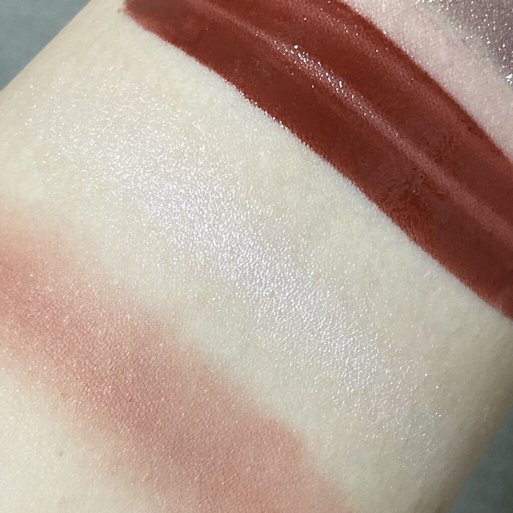 淡いピンクのカラーもさることながら 多色ラメ(ピンクラメが多めかな🤔?)の 煌めきが綺麗〜✨ 02 Innocent Auraのアクアジェムは 淡いピンクカラーなので、 うすーく伸ばしてハイライトっぽくも使えるかなと目論見中です🤣笑 アイシャドウとしての使用は抜群に可愛いです🥰