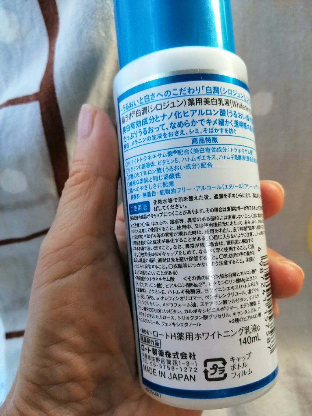 - < 140ml(ボトル)> 有効成分 トラネキサム酸 その他の成分 ヒアルロン酸Na-2、ベヘニルアルコール、BG、ジグリセリン、ステアリン酸ソルビタン、加水分解ヒアルロン酸、キサンタンガム、フェノキシエタノール、DPG、ヒドロキシエチルセルロース、濃グリセリン、ビタミンE、ペンチレングリコール、ビタミンCリン酸Mg、エデト酸塩、メドウフォーム油、トリオクタン酸グリセリル、カルボキシビニルポリマー、ヨクイニンエキス、ハトムギ発酵液、α-オレフィンオリゴマー、イソステアリン酸POE(20)ソルビタン <140ml(つめかえ用)> 有効成分 トラネキサム酸 その他の成分 ヒアルロン酸Na-2、ベヘニルアルコール、BG、ジグリセリン、ステアリン酸ソルビタン、加水分解ヒアルロン酸、キサンタンガム、フェノキシエタノール、DPG、ヒドロキシエチルセルロース、濃グリセリン、ビタミンE、ペンチレングリコール、ビタミンCリン酸Mg、エデト酸塩、メドウフォーム油、トリオクタン酸グリセリル、カルボキシビニルポリマー、ヨクイニンエキス、ハトムギ発酵液、α-オレフィンオリゴマー、イソステアリン酸POE(20)ソルビタン