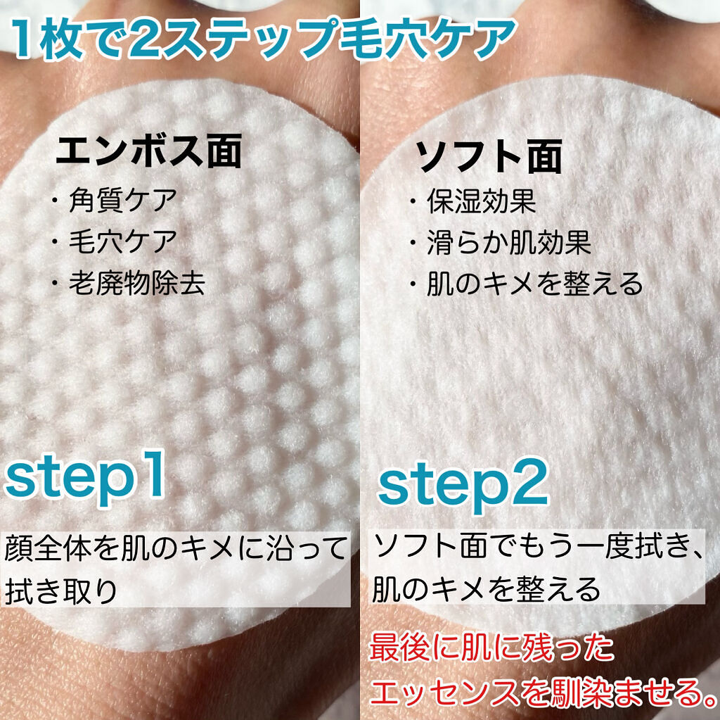 - 毛穴の汚れを拭き取り、肌を引き締めることで肌をなめらかに整える拭き取りパッドです。 しっとりしたエッセンスがたっぷり含まれ、肌のキメを整えつつ、自然なツヤ肌に仕上げます。 <使用方法> 洗顔後、パフのエンボシング面を使い、目と口周りを避けて顔全体を拭き取ります。 裏の軟らかい面を使い、もう一度拭き取りながら軽くパッティングしてください。