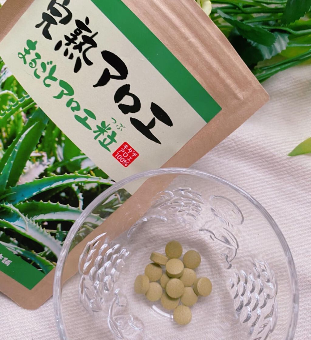 完熟アロエ まるごとアロエ粒を試してみました。こちらは、完熟キダチアロエを皮までまるごと粉砕し、粒状にギュッと圧縮しています。固める凝固剤や防腐剤などの添加物を一切使用していません。国産キダチアロエ100%使用していて、全成分アロエ葉粉末。健...