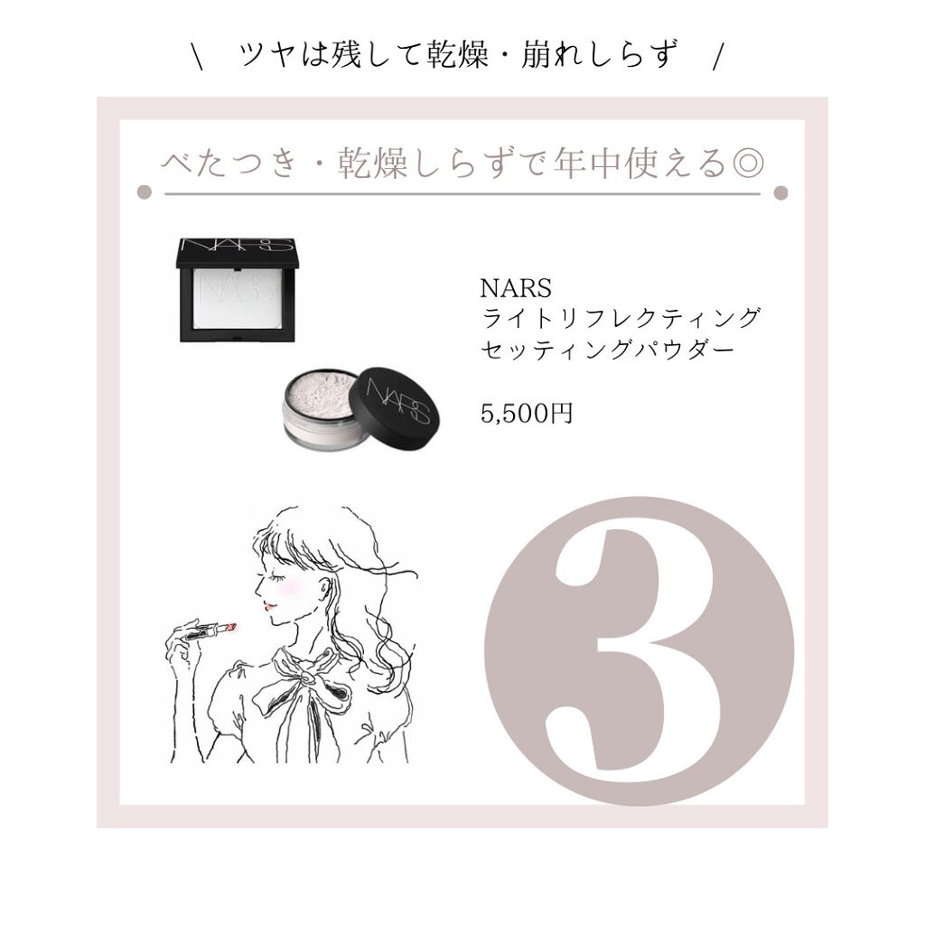 私は基本ツヤ肌、透明感のある肌が好きですが、たまに陶器肌を目指したくなるときがあります❤︎ なのでツヤ肌仕上げのものも、少しマット肌仕上げのものも大好きです。 今は、乾燥せず、適度に艶は残してくれて、肌はサラッと仕上がるNARSのリフ粉が特にお気に入りです❤︎